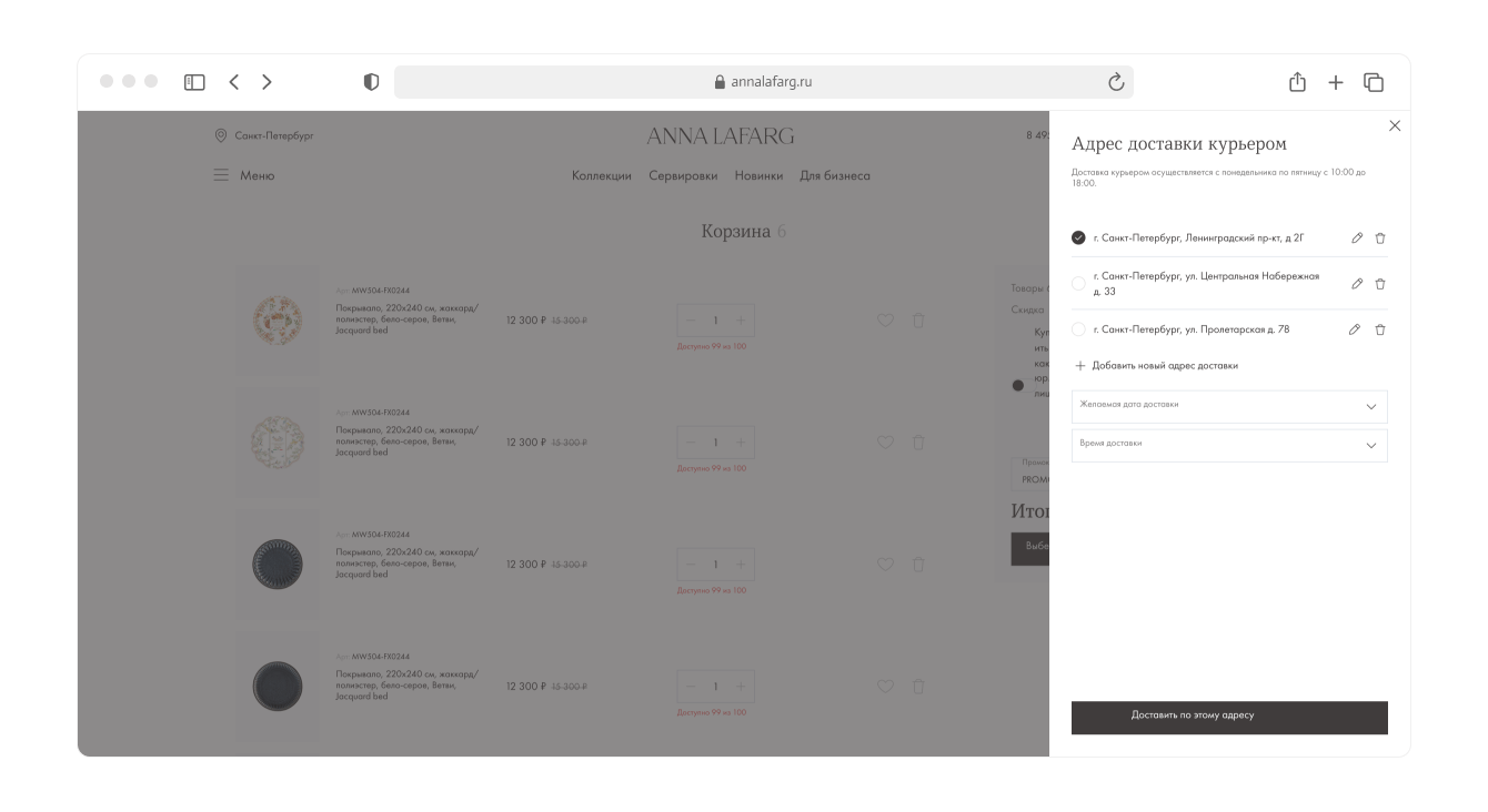 Для физических лиц предусмотрен привычный B2C-сценарий покупок: оформление без участия менеджера, оплата, выбор даты доставки, интеграция со службами Dalli и DPD.