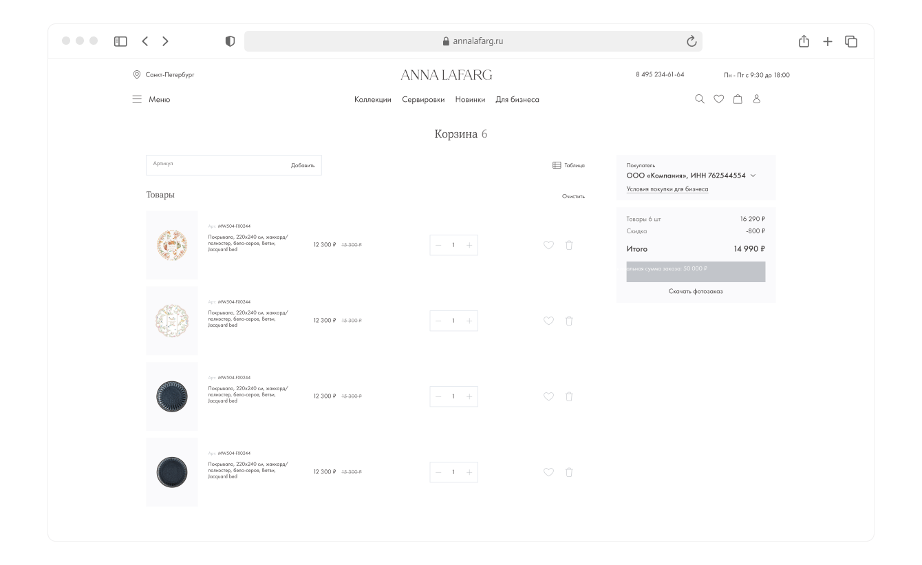 При формировании и оформлении заказа юридические лица получают расширенный функционал. Они могут быстро добавлять позиции в корзину по артикулу, им доступны специальные акции. Скидки работают по собственной логике. На бэке создан конструктор, через который администраторы задают условия — от какой суммы действует та или иная скидка, какие акции применяются для конкретных клиентов.