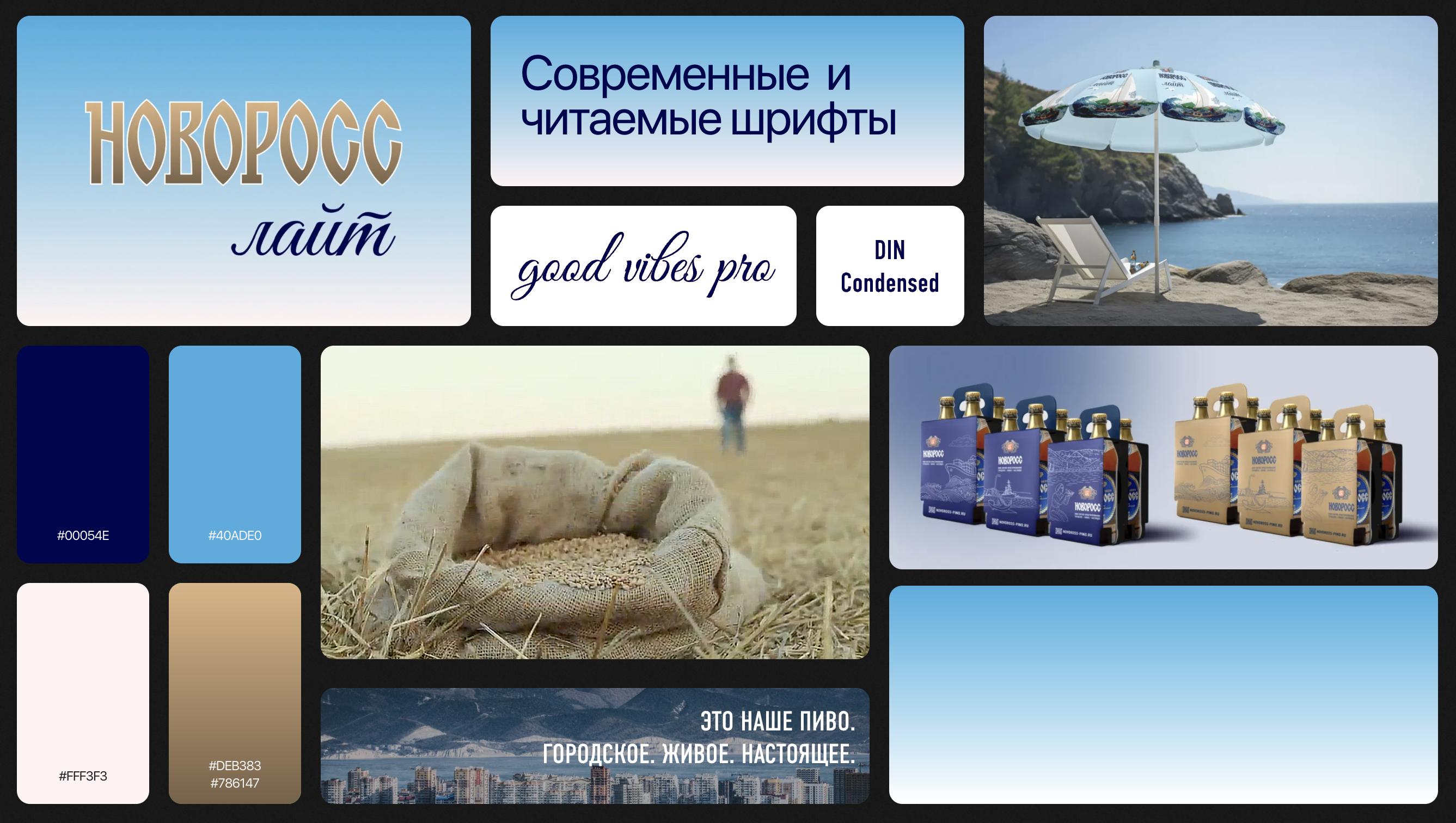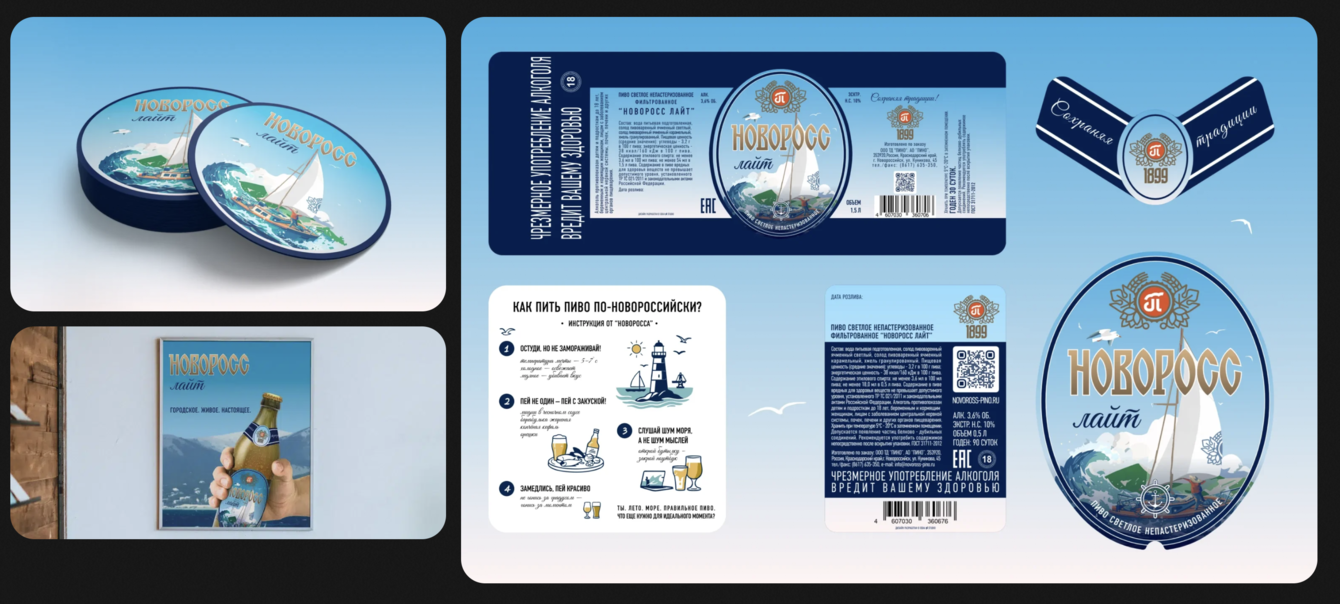 Компания обратилась к нам с задачей разработки дизайна этикетки для новой линейки пива “Новоросс Лайт” и подарочной упаковки для своей продукции. Предстояло не просто создать новый, современный дизайн, который бы передавал настроение морского города в летнее время но и сохранить в нем главные ценности бренда:
