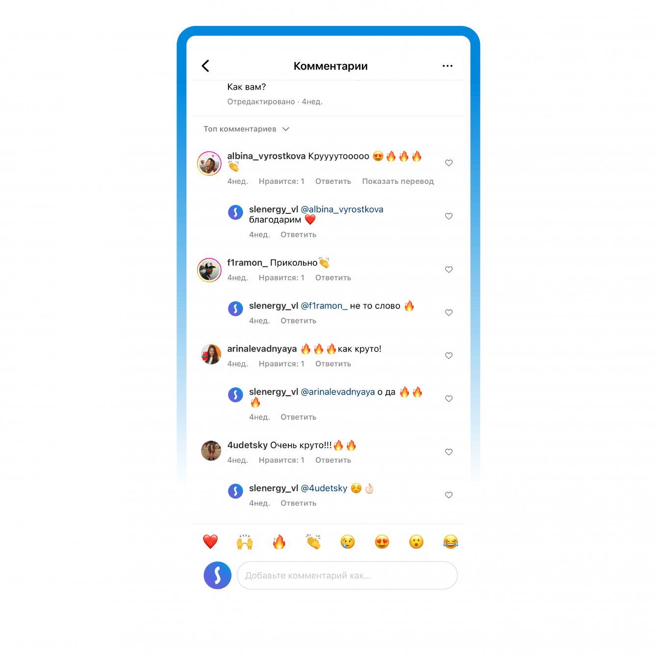 Взаимодействие с ЦА выросло органическим путём. Члены комьюнити отождествляют себя с внедрёнными персонажами и активно реагируют на контент. Мы не придумали что-то новое, скорее наоборот, опираясь на тренды и опыт, мы вывели экосистему Slenergy на новый уровень.