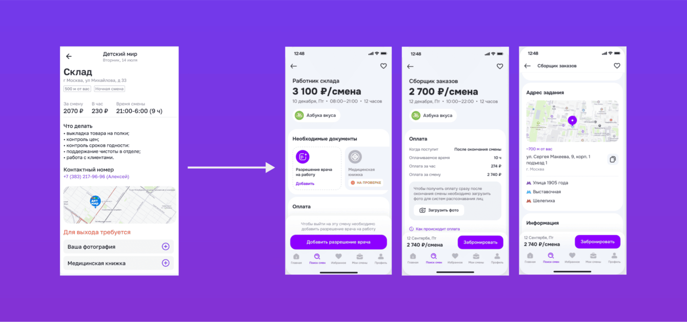 На этом этапе оптимизировали путь пользователя, продумали жизненные циклы смен, обновили дизайн и решили ряд других бизнес-задач.