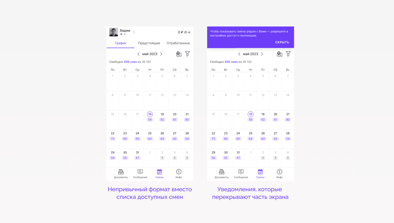 — Определили, какие решения в их приложениях работают хорошо, а какие вызывают сложности. Например, узнали, что отображение смен на карте и в календаре удобнее, чем простой список смен, в то время как многоступенчатая регистрация может отталкивать.