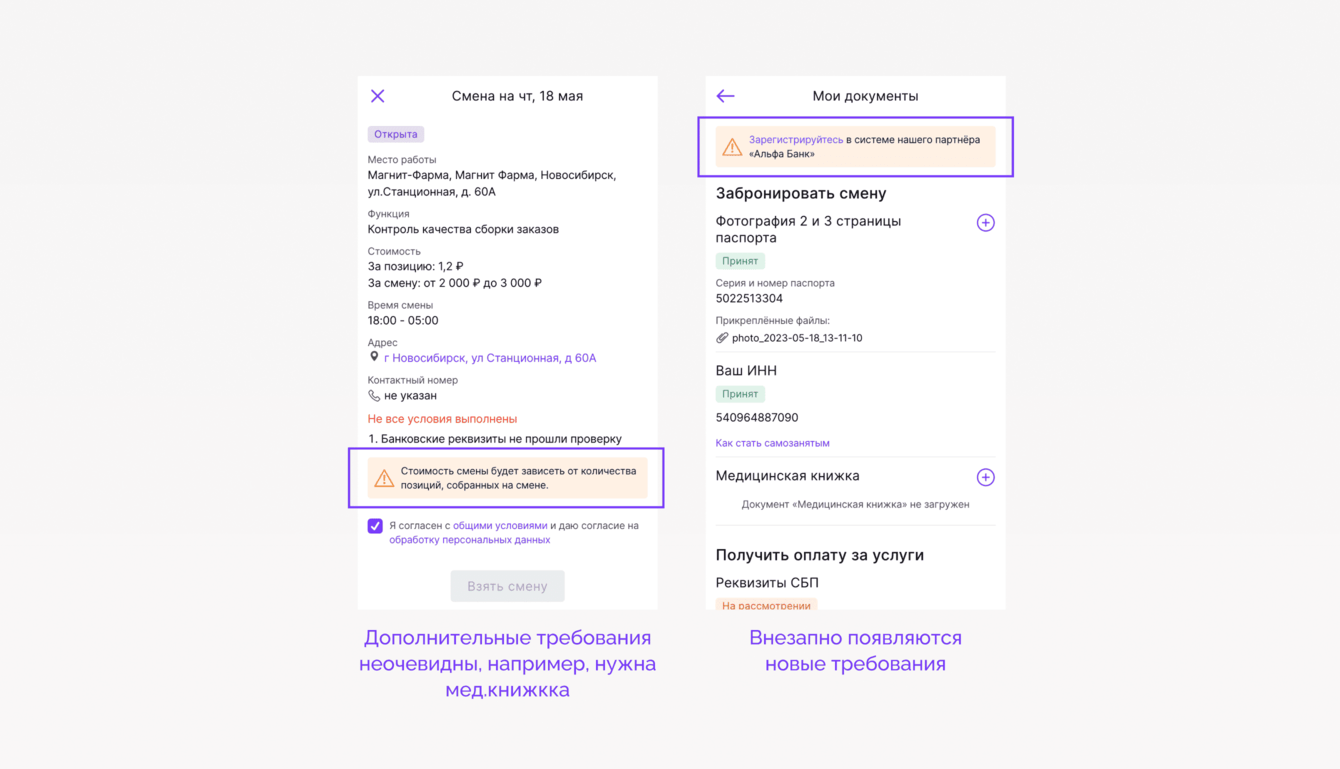 Например, если для подработки в магазине продуктов нужна медицинская книжка, пользователю должен увидеть смены в этом магазине, только когда он подтвердит её наличие. Кроме того, требования к пользователю должны быть очевидными. Их лучше объединить и показать заранее, в процессе регистрации.