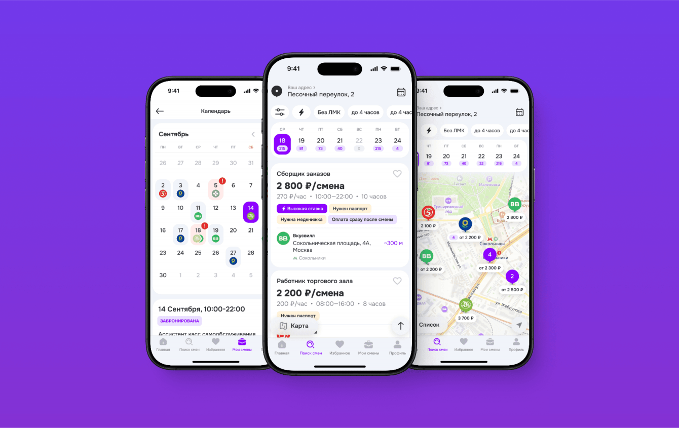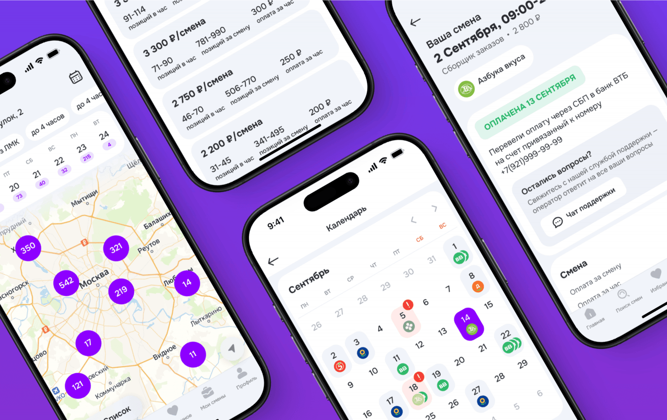 — Определили, какие решения в их приложениях работают хорошо, а какие вызывают сложности. Например, узнали, что отображение смен на карте и в календаре удобнее, чем простой список смен, в то время как многоступенчатая регистрация может отталкивать.