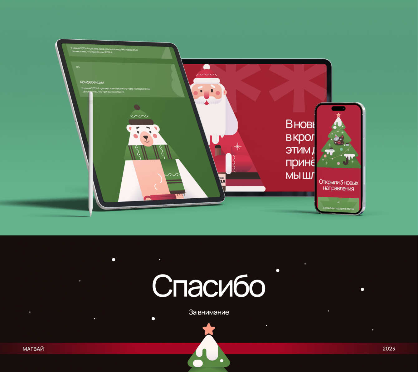 Чтобы поддержать новогоднюю концепцию, взяли за основу два цвета — красный и зелёный, которые ассоциируются с этим праздником.