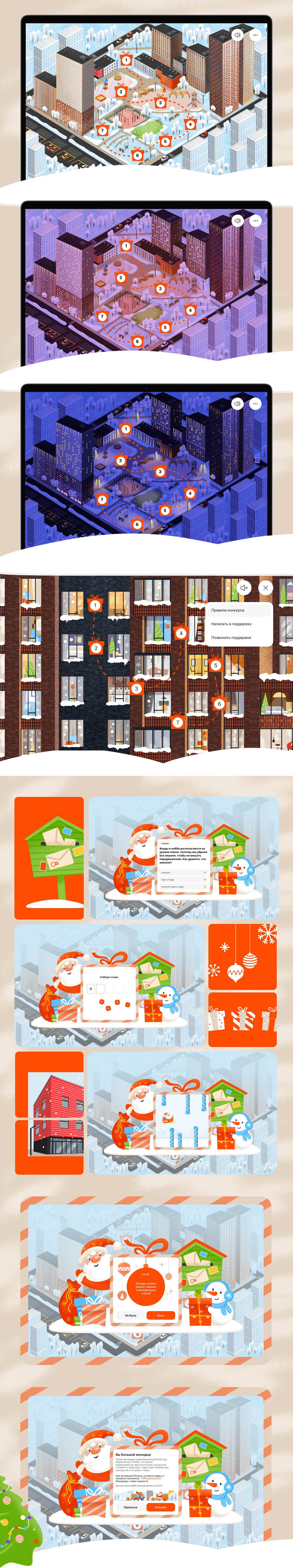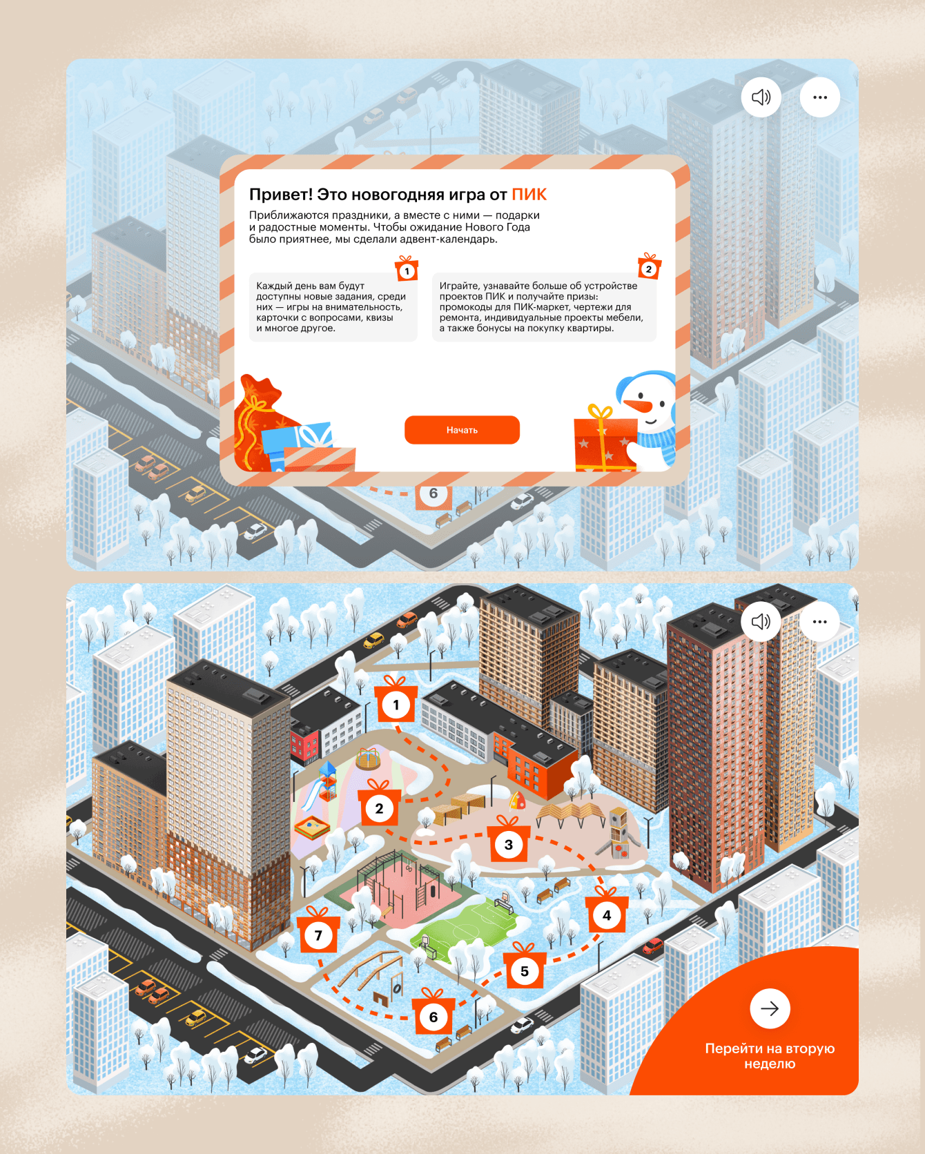 Внутри ЖК располагались точки адвент-календаря, по которым шёл пользователь. Каждый день открывалась новая точка адвента и новая механика, после прохождения которой игрок получал промокод на скидку. Точки-здания сопровождались уникальными иллюстрациями под каждую специфику задания и раскрывали отдельную тему инфраструктуры ПИК.