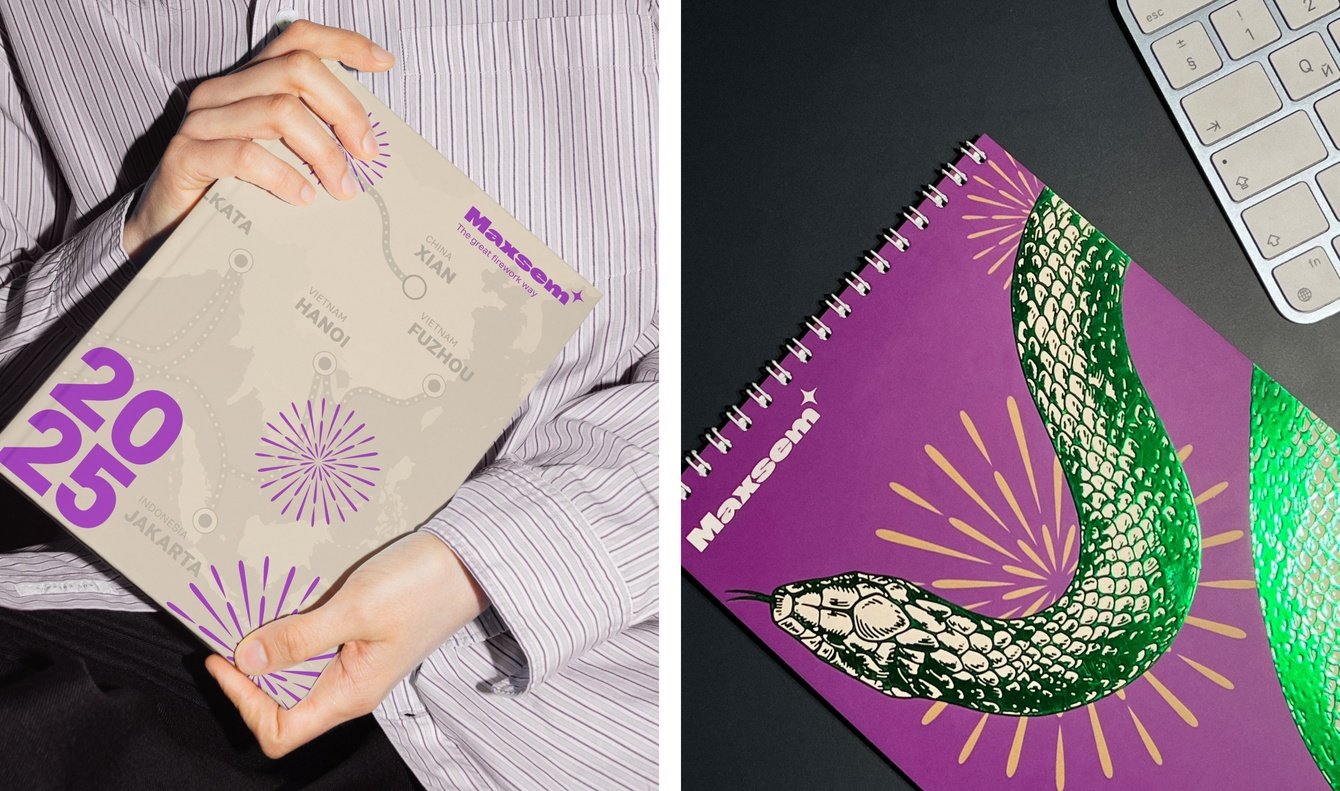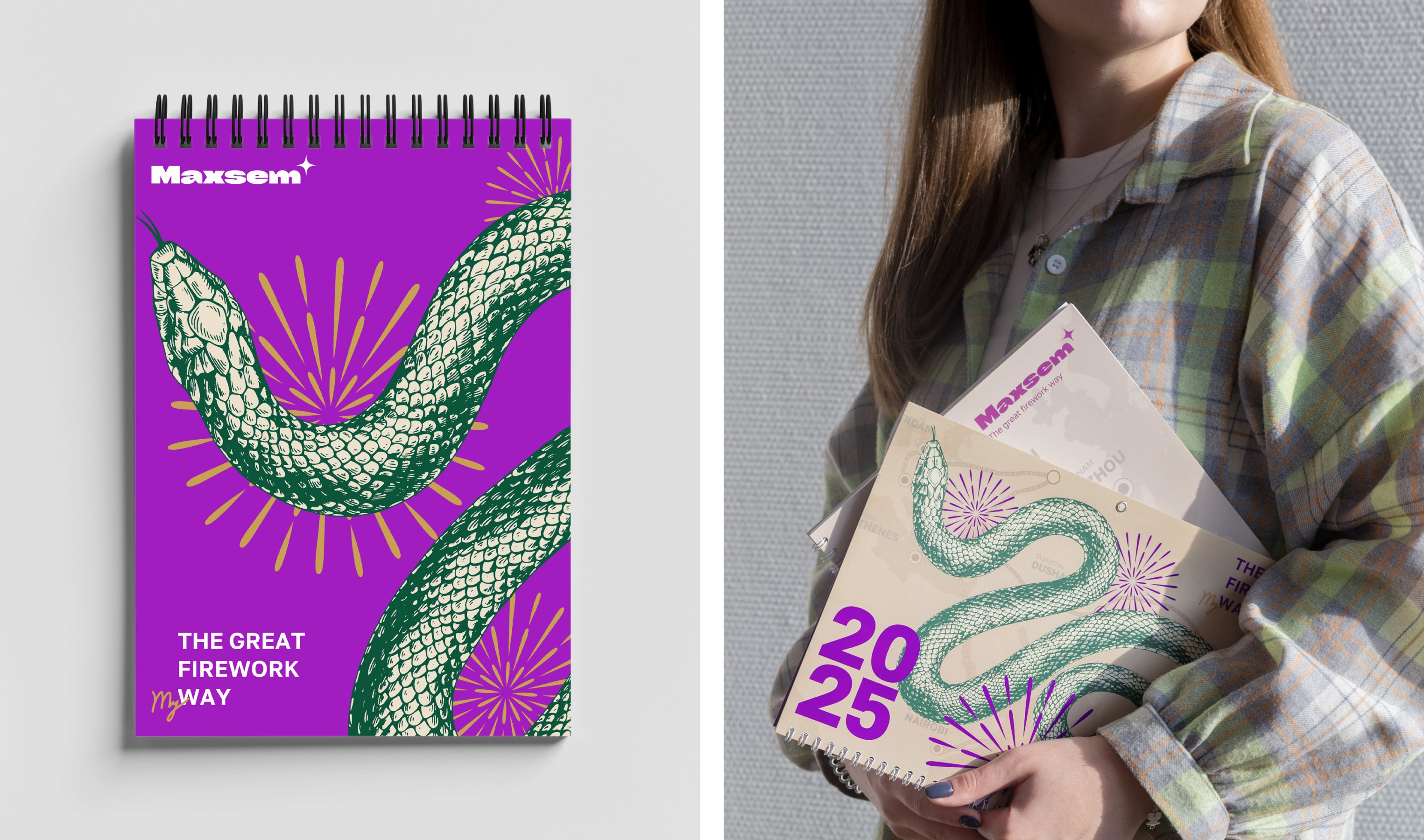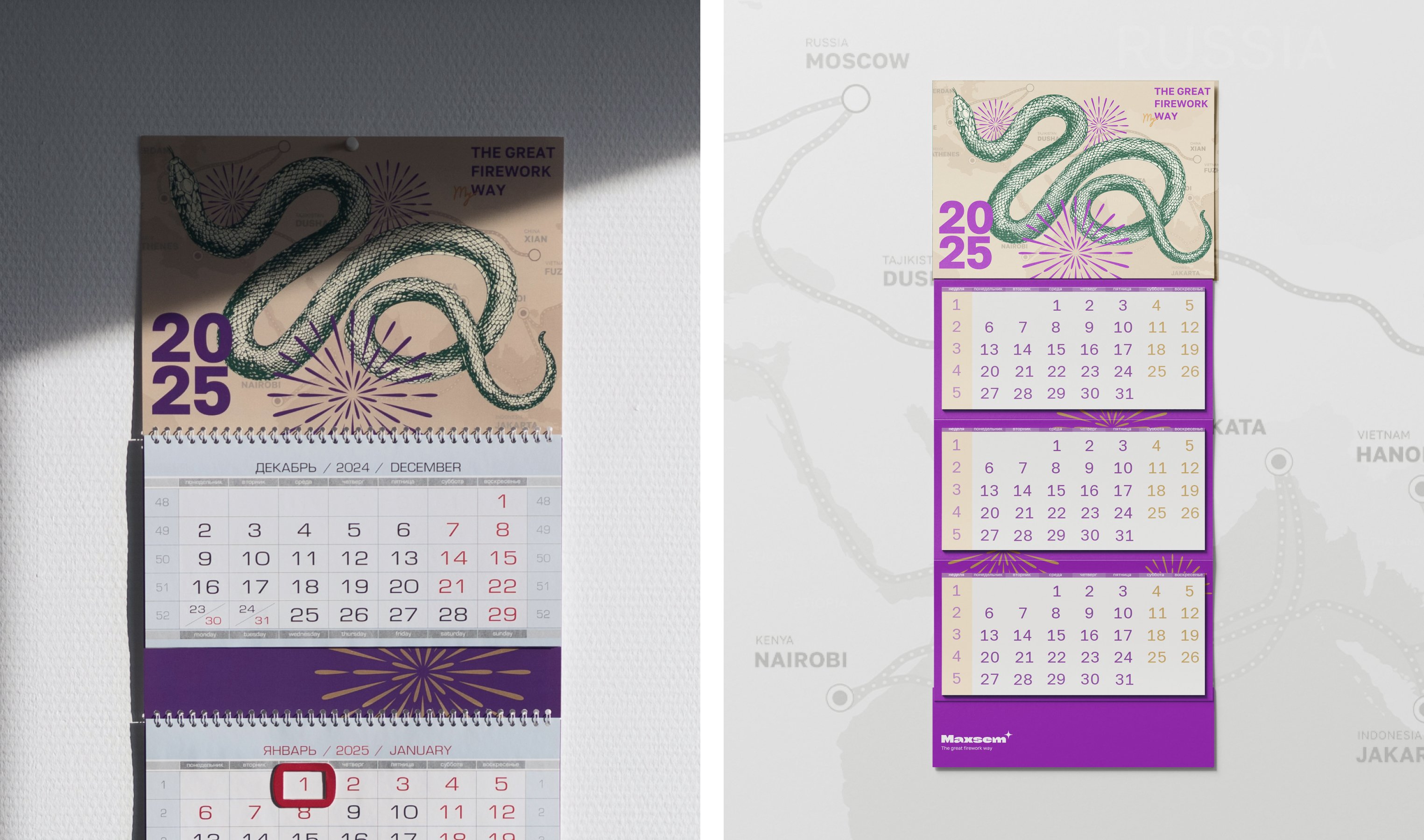 Визуальный центр набора — настенный календарь, где символ года — змея — становится не просто декором, а метафорой времени и движения. В основе — единая композиция: изящный силуэт змеи, вплетённый в графику «Шёлкового пути» и фирменного стиля Maxsem. Постпечатная обработка — выборочный лак и фольгирование — подчёркивает детализацию и премиальность подачи. Календарь создан, чтобы оставаться заметным на стене весь год — как знак, как ориентир, как часть новогоднего маршрута бренда.