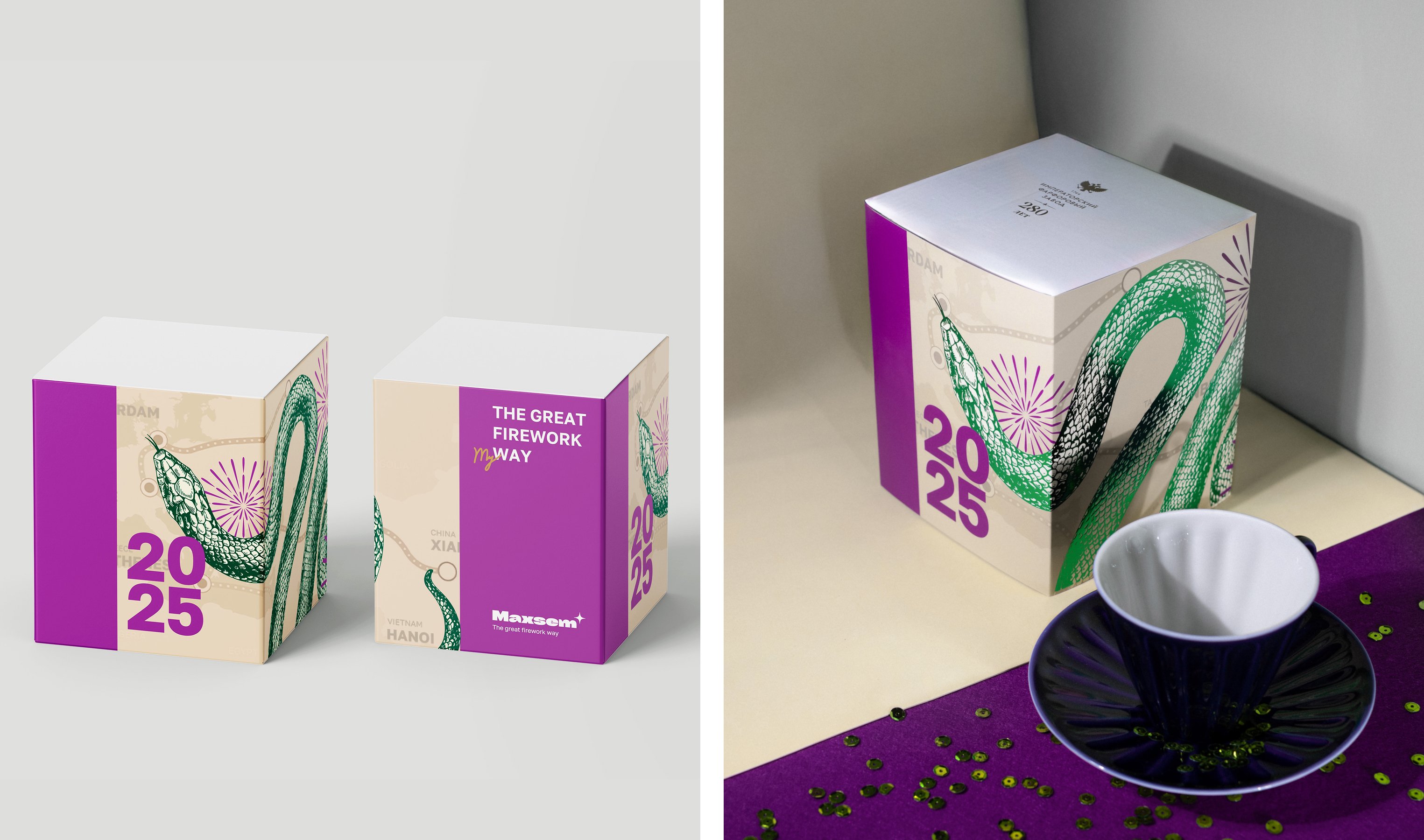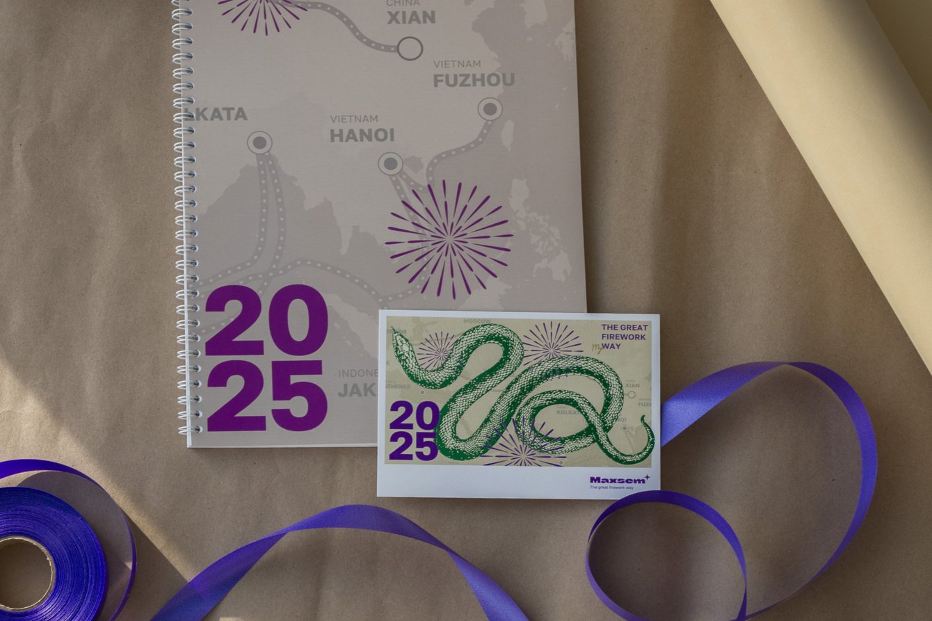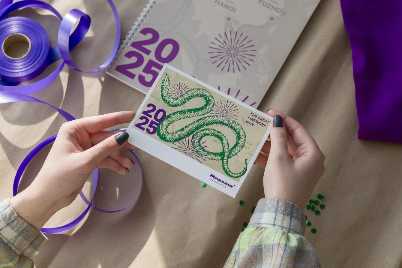 Визуальный центр набора — настенный календарь, где символ года — змея — становится не просто декором, а метафорой времени и движения. В основе — единая композиция: изящный силуэт змеи, вплетённый в графику «Шёлкового пути» и фирменного стиля Maxsem. Постпечатная обработка — выборочный лак и фольгирование — подчёркивает детализацию и премиальность подачи. Календарь создан, чтобы оставаться заметным на стене весь год — как знак, как ориентир, как часть новогоднего маршрута бренда.