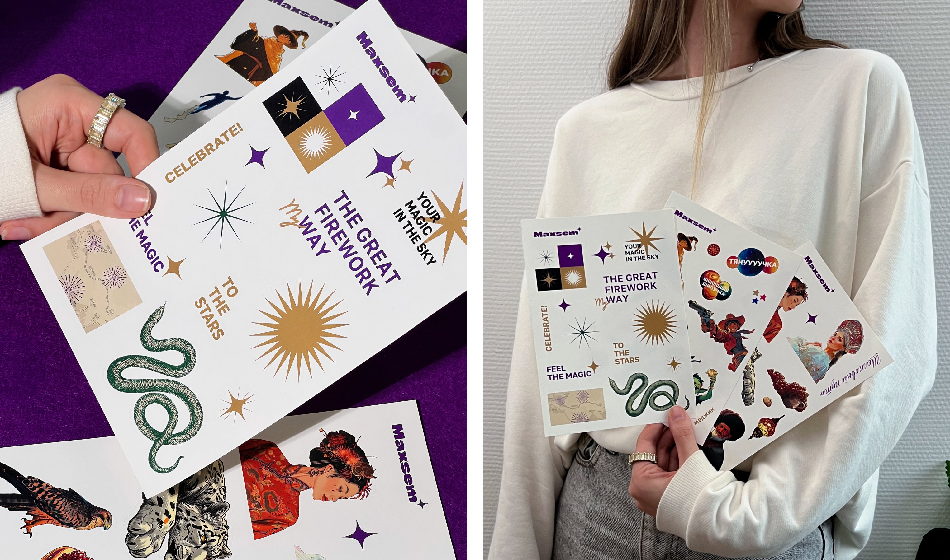 Для усиления вовлечения мы добавили три набора стикеров. Два набора стикерпаков с персонажами с упаковки салютов из линейки «Шёлковый путь» и из линейки пиротехнической продукции первого класса: хлопушки, бенгальские огни, петарды. Третий — с фирменными элементами Maxsem. Это игра, которая объединяет продуктовую линейку и корпоративную идентичность. А ещё — повод улыбнуться и поделиться эмоцией.