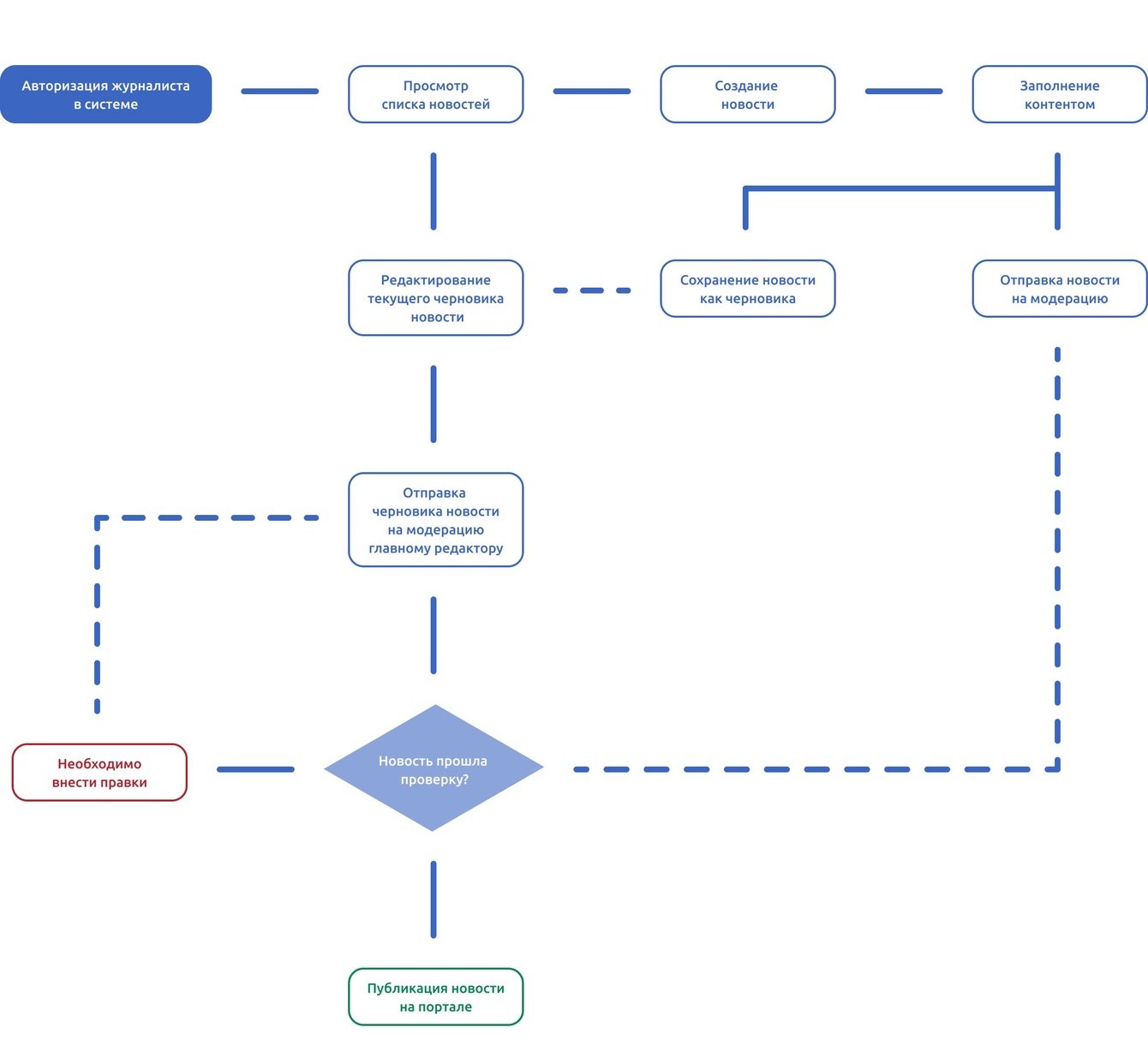 Для упрощения процесса публикации новостей и их модерации главным редактором, нами был разработан отдельный виртуальный офис. Новости публикуются по принципу KANBAN, изначально проходя стадию модерации главным редактором.