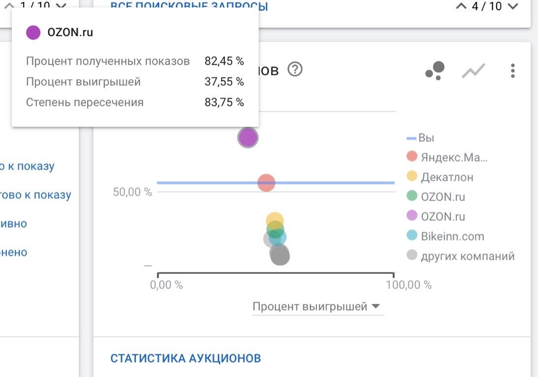Кроме того такие крупные игроки, как Озон и Яндекс.Маркет, выделяют собственные рекламные бюджеты для показа объявлений продавцов в топе поиска. Это можно увидеть при анализе конкурентов в Google Рекламе на скриншоте ниже.