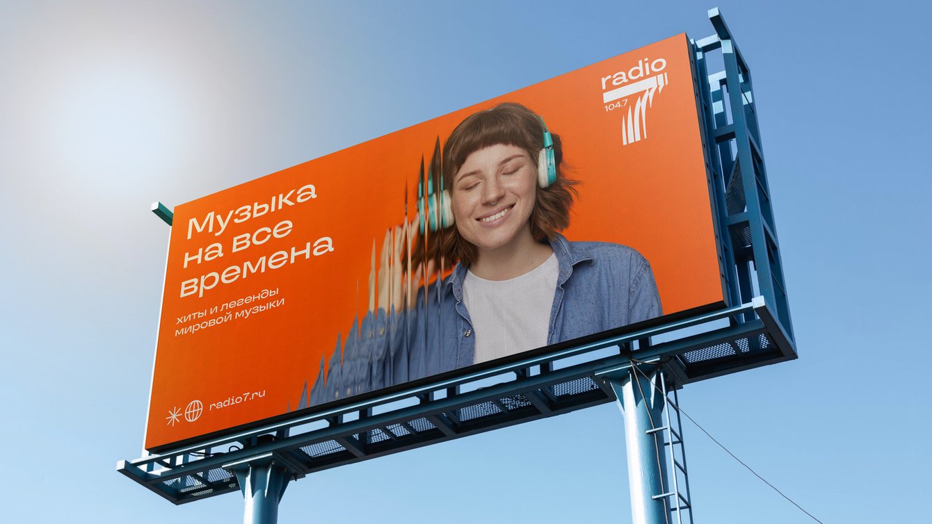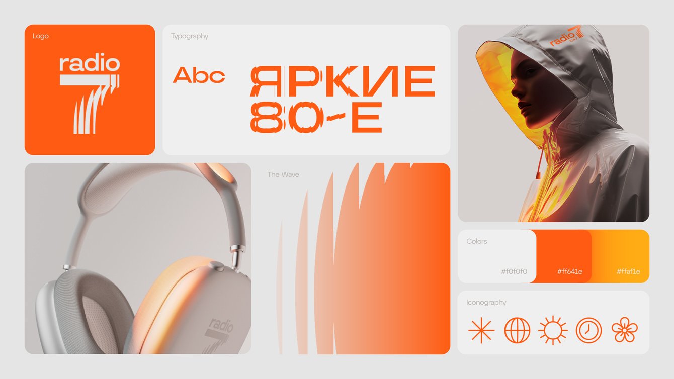 В процессе разработки нового стиля мы изменили почти все, кроме фирменного цвета. Оранжевый давно стал одним из символов Радио 7. Графический прием в виде волнового искажения в логотипе делает семерку более динамичной и транслирует, что радиостанция стала более энергичной.