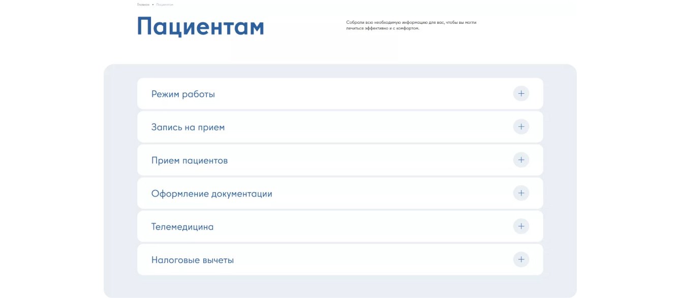 Далее работа велась над внутренними страницами клиники: о компании, часто задаваемые вопросы, отзывы, контакты и загрузка прайса. Мы сконцентрировались на преимуществах проекта BMP: к примеру, врачи медучреждения проводят онлайн-консультации — и все нюансы в работе с телемедициной мы показали в разделе FAQ.
