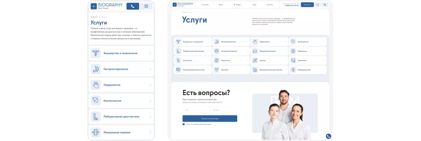 Этапы включают в себя проектирование, создание дизайн-макета, верстку и тестирование. Ниже мы предлагаем вам ознакомиться с нашим подходом к разработке сайта для многопрофильных клиник.