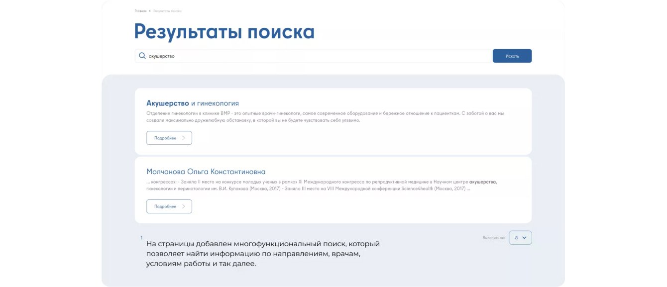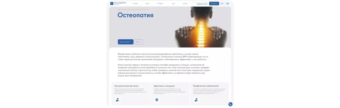 В дизайне используются фирменные цвета: белый, черный и серый разграничивают блоки друг от друга, а синий выделяет ключевые элементы. На главной странице мы разместили преимущества проекта BMP, основные направления клиники, раздел с персоналом, отзывы пациентов и форму для обратной связи.