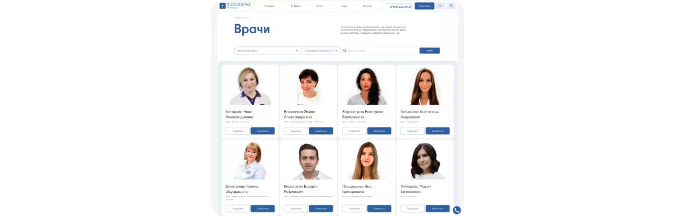 Пациентам для принятия решения важно узнать о своем лечащем враче, поэтому мы создали раздел с персоналом и оформили карточки для каждого специалиста. На общей странице посетитель может использовать фильтр, чтобы найти конкретного врача или выбрать интересующую его специализацию и принять решение.