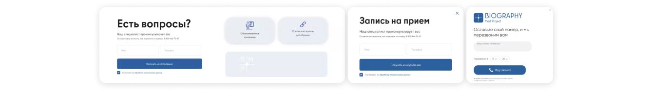 Проработали лид-формы: «Запись на прием» и «Получить консультацию». Сделали их удобными и простыми — пациенту достаточно указать свое имя и оставить номер телефона.