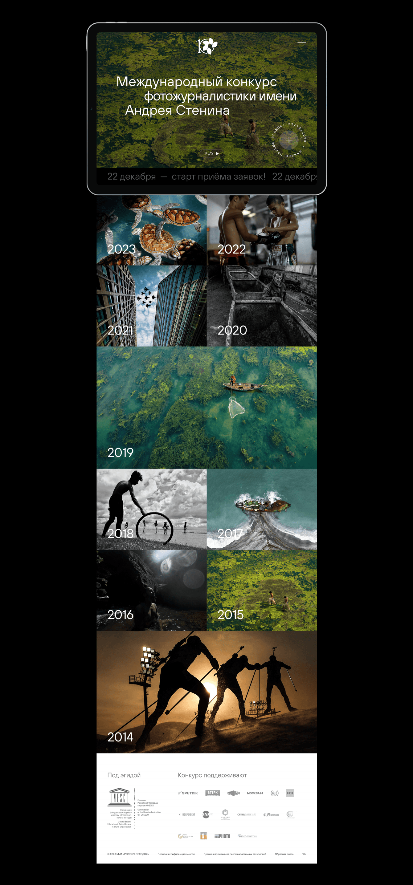Идея заключается в том, что весь сайт фотоконкурса это большая фотовитрина. Все внимание отдано фотоработам. Основные действия вынесены на главную страницу — точка входа на регистрацию, бегущая информационная строка для оповещения участников об основных этапах конкурса, наглядный архив предыдущих лет.