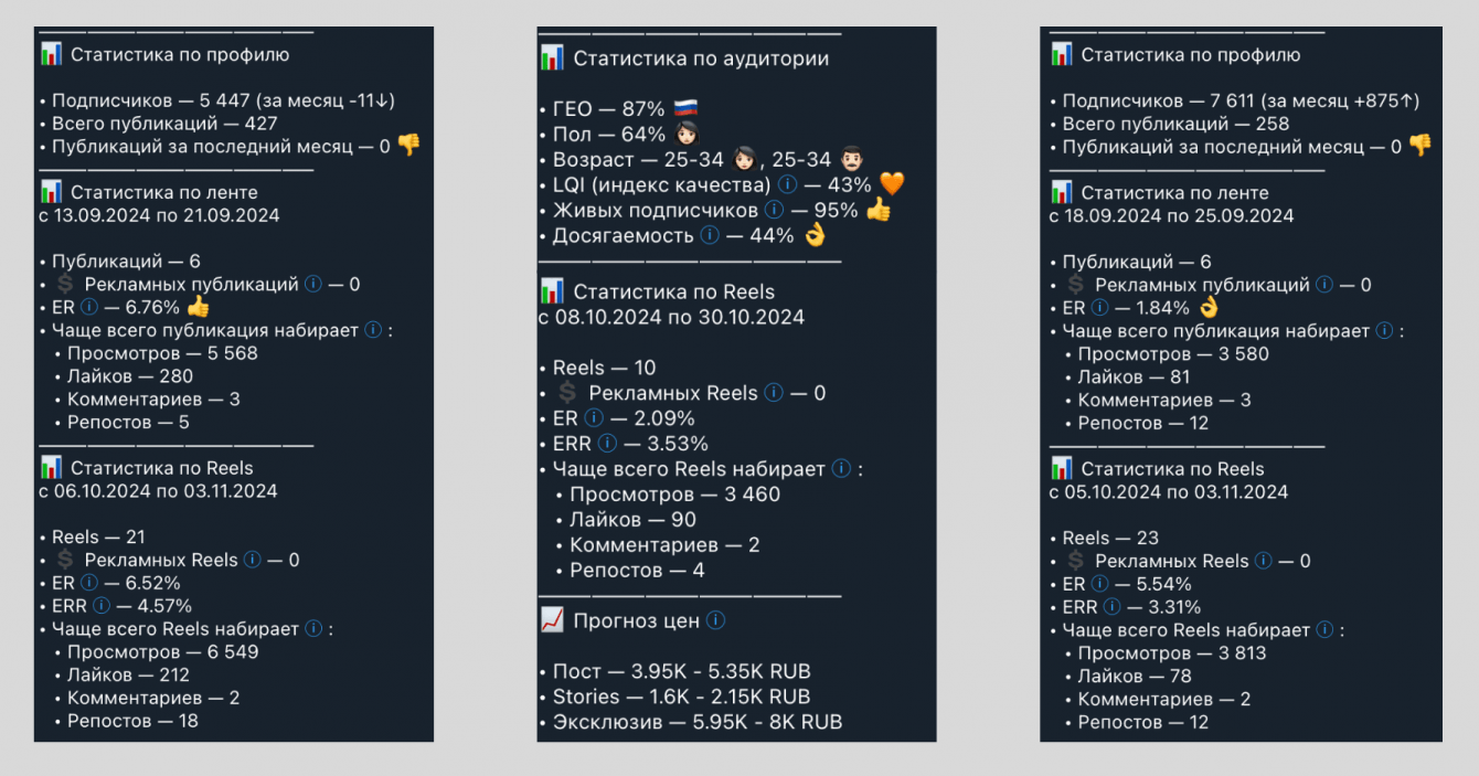Для аналитики мы используем бот от Labelup, который позволяет проверить не только вышеперечисленные показатели, но и такие как прирост подписчиков за месяц, статистику по аудитории (пол/возраст/гео), прогноз цен.