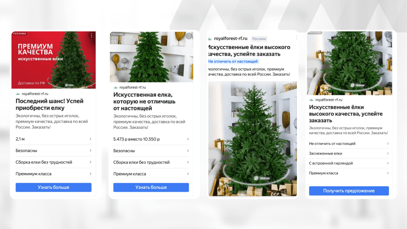 Royal Forest – магазин искусственных елок премиум класса. В ассортименте было более 12 деревьев с большим размерным рядом (от 0,6 м до 4,25 м). Ранее компания не продвигалась: вышла в онлайн буквально перед концом 2023 года.