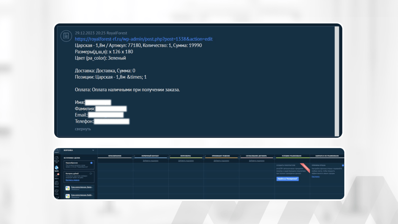 Также сделали воронку продаж и провели интеграцию сайта на WordPress и AmoCRM. Мы самостоятельно нашли решение для интеграции сайта, помогли его оплатить и дали техническое задание разработчику, так как базовые решения не позволяли закрыть данную проблему. Так, все заявки улетали в Amo, и менеджерам было проще работать с заказами: в заявке были видны название, размер и цвет елки, а также контактные данные клиента.