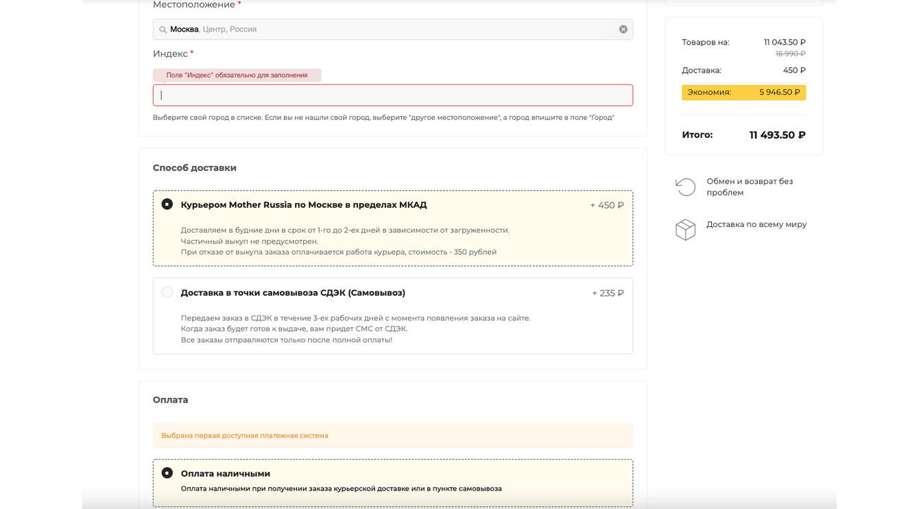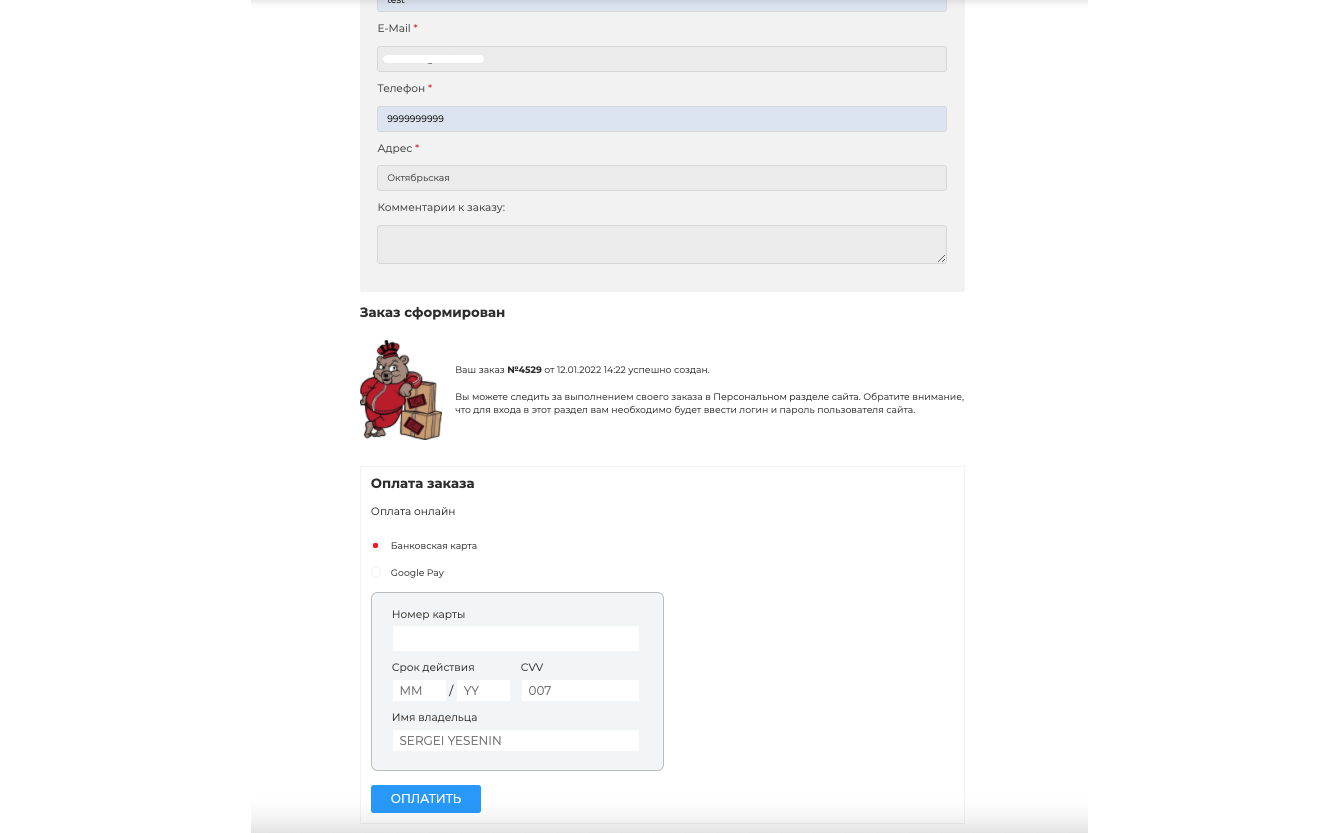 2. Онлайн-оплата выводится прямо на странице “оформления заказа” без перехода и лишнего клика.