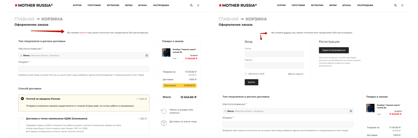 2. На странице "Оформление заказа" сделали возможность войти в свой профиль в режиме одного окна, а не всплывающего.