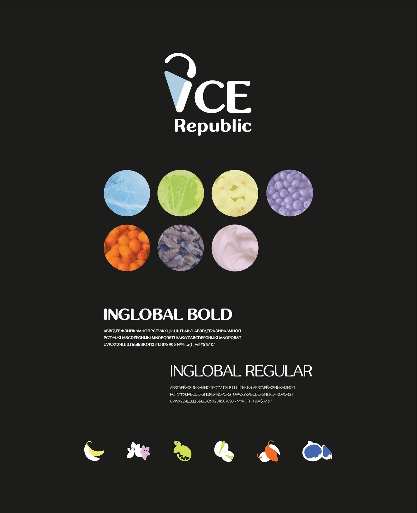 Логотип развивается в контрастный паттерн: рожки находятся в окружении фруктов и цветков ванили. Все элементы перекликаются друг с другом, из них появляются новые формы. Так же как сочетание привычных и понятных ингредиентов рождает свежие, оригинальные вкусы мороженого Ice Republic.