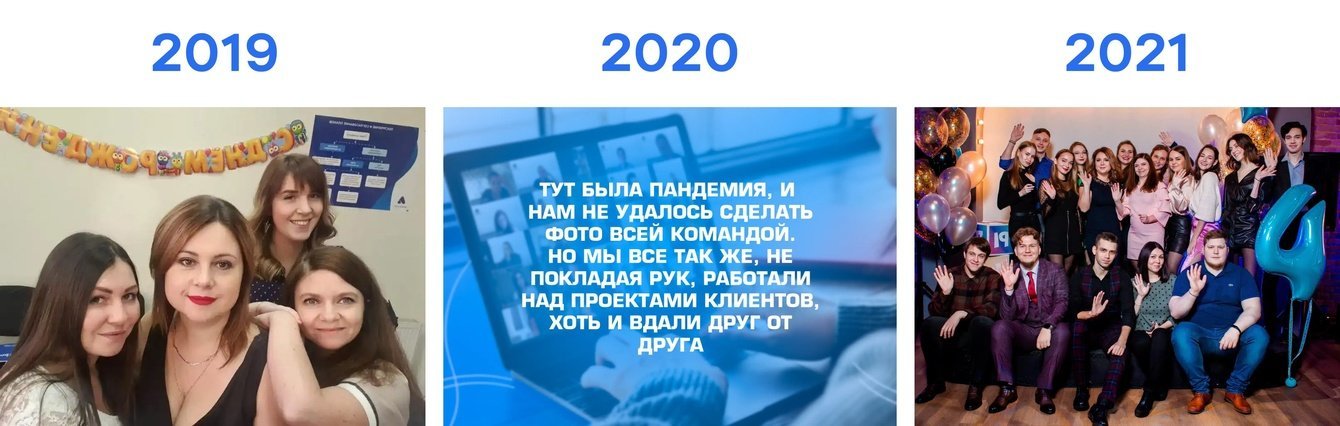 Для тех лет, когда не было общих фотографий, мы разработали картинки-объяснения с шуточным подтекстом, чтобы не оставлять пробелов и вопросов. Такая визуализация нашей истории вызывает бОльшее доверие у аудитории и потенциальных клиентов. Она показывает, что все достижения, о которых мы рассказываем, — это не просто сухие факты, а заслуга реальных людей и их труда: «вот те самые специалисты, которые достигли этих результатов, и мы готовы продолжать во благо и вашего бизнеса». В наступающую эру автоматизации и искусственного интеллекта так не хватает связей «человек-человек», и мы хотим это исправить.