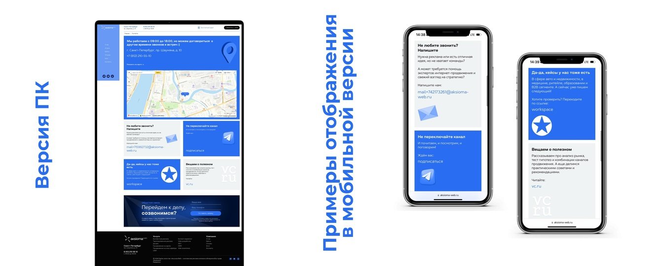 На этой странице мы оставили все возможные данные: адрес (с привязкой логотипа к карте), телефон, e-mail и социальные сети.