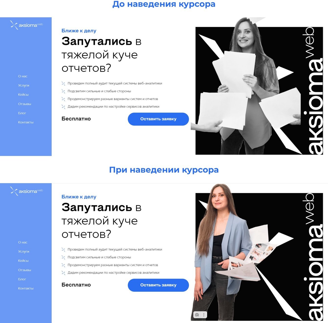 Готовые снимки адаптировали под макет и установили имиджи на страницы услуг. По дизайн-проекту они расположились в двух местах на странице: в блоке с инструментами (в статике) и в блоке с предложением бесплатного аудита и кнопкой для лидогенерации (в динамике). Анимацию реализовали так, что черно-белая фотография специалиста меняется на цветную при наведении курсора на нее.