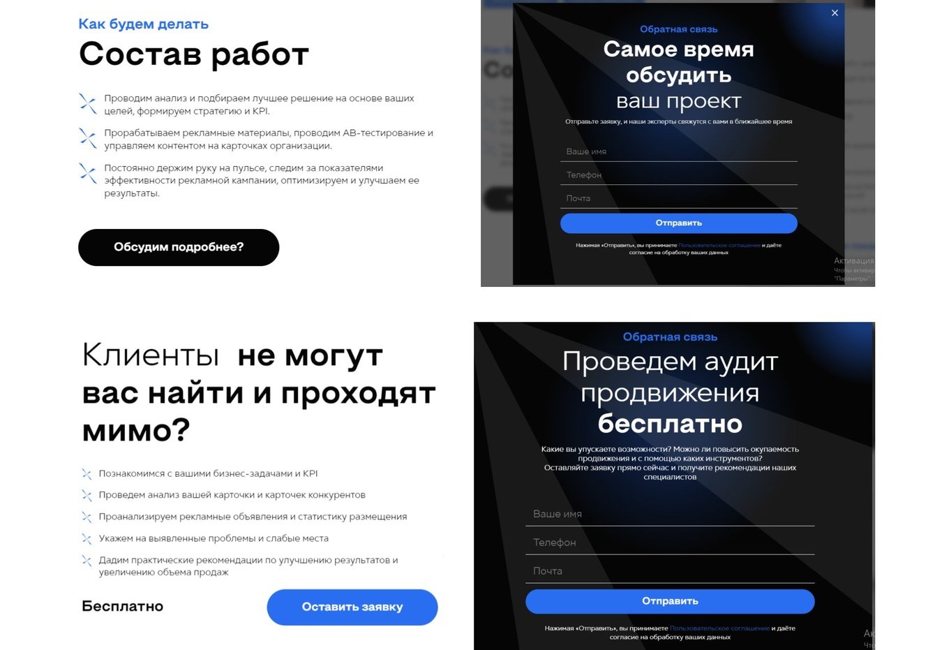 — разработали уникальные формы обратной связи для каждой из страниц;