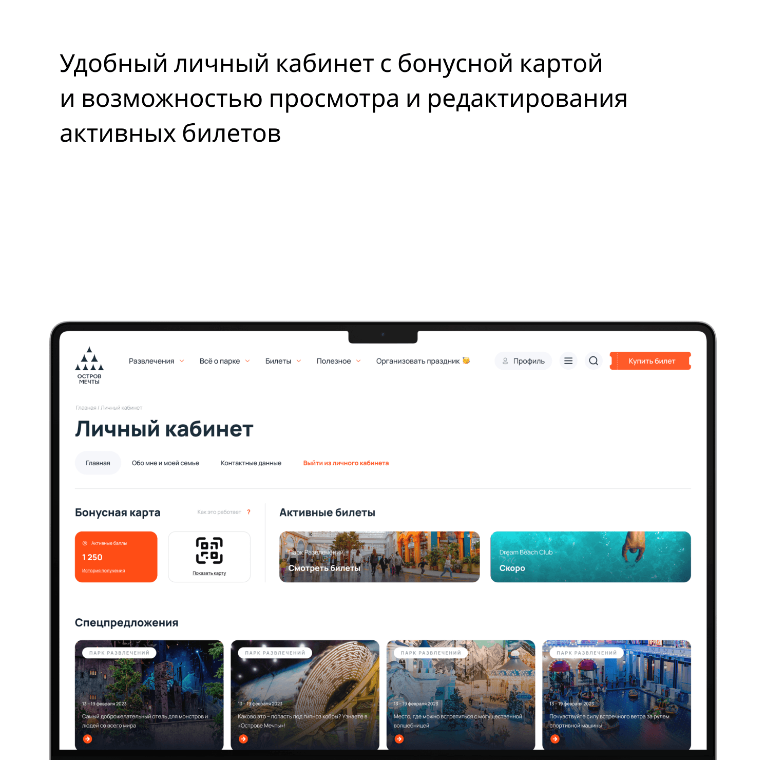 Клиент обратился к нам за разработкой нового сайта «Остров мечты» с расширенным функционалом. Основная задача состояла в создании удобного интерфейса для продажи билетов на мероприятия и развлечения всех направлений развлекательного комплекса.