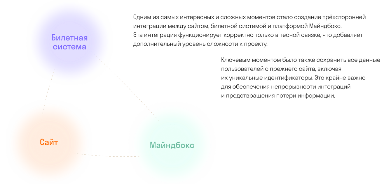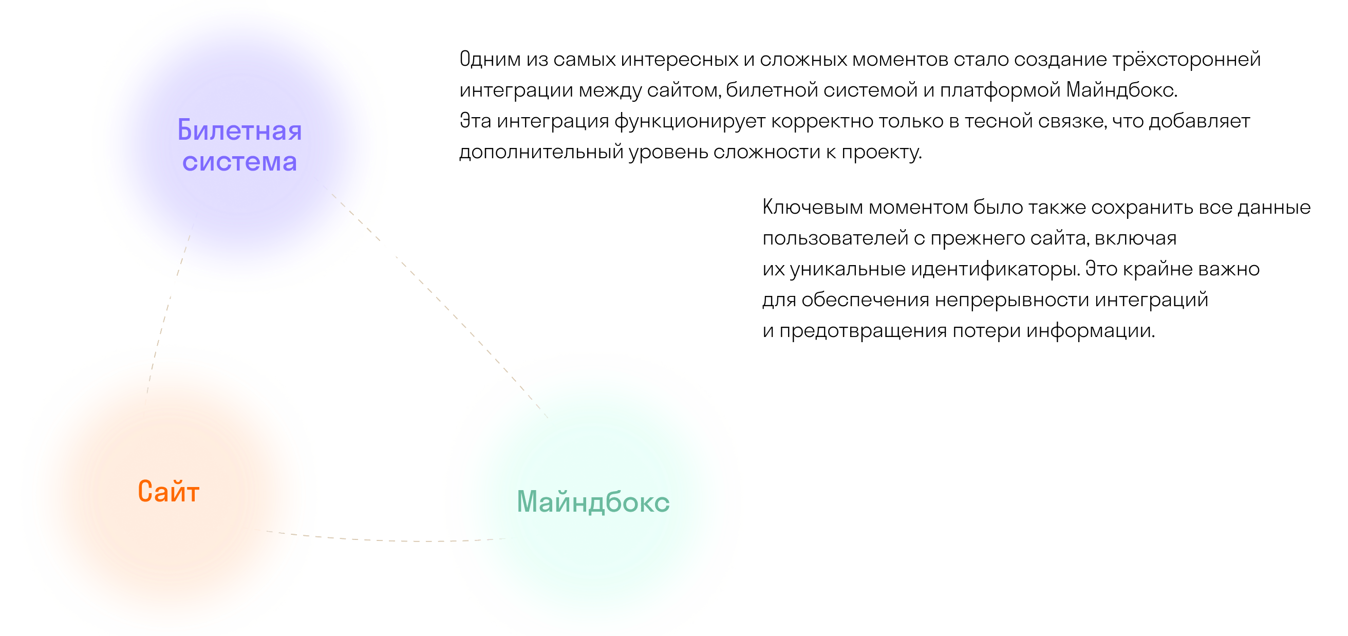 Во‑первых, ранее в методах обмена между сайтом и MindBox, а также билетной системой использовалось избыточное количество параметров, многие из которых были фактически ненужными и не оказывали влияния на процесс. Эти параметры представляли собой рудиментарные элементы, наследие устаревшего сайта и прежних решений, которые на протяжении времени сохранились, но уже не использовались. Теперь мы оптимизировали методы, убрав ненужные параметры и упростив взаимодействие.