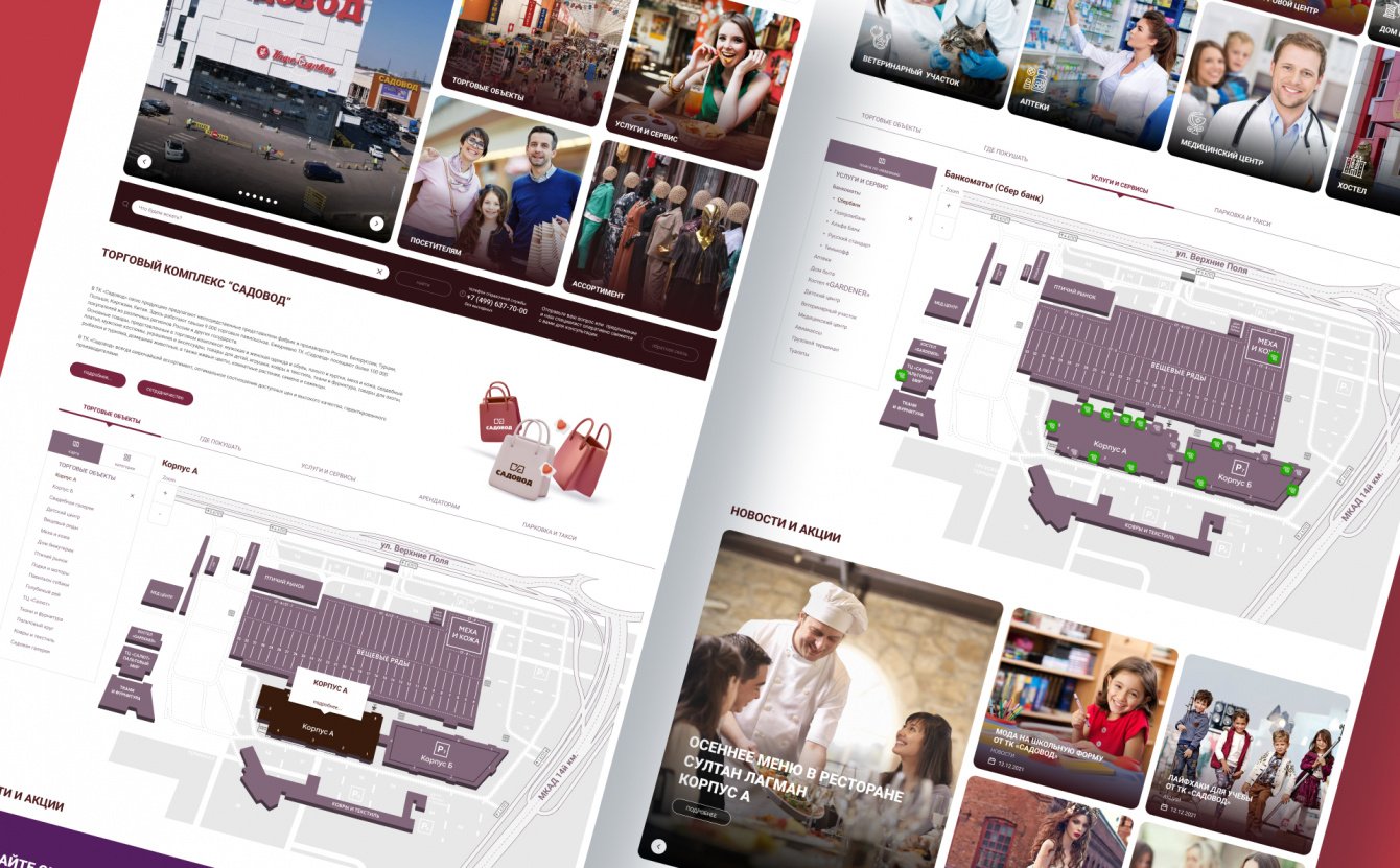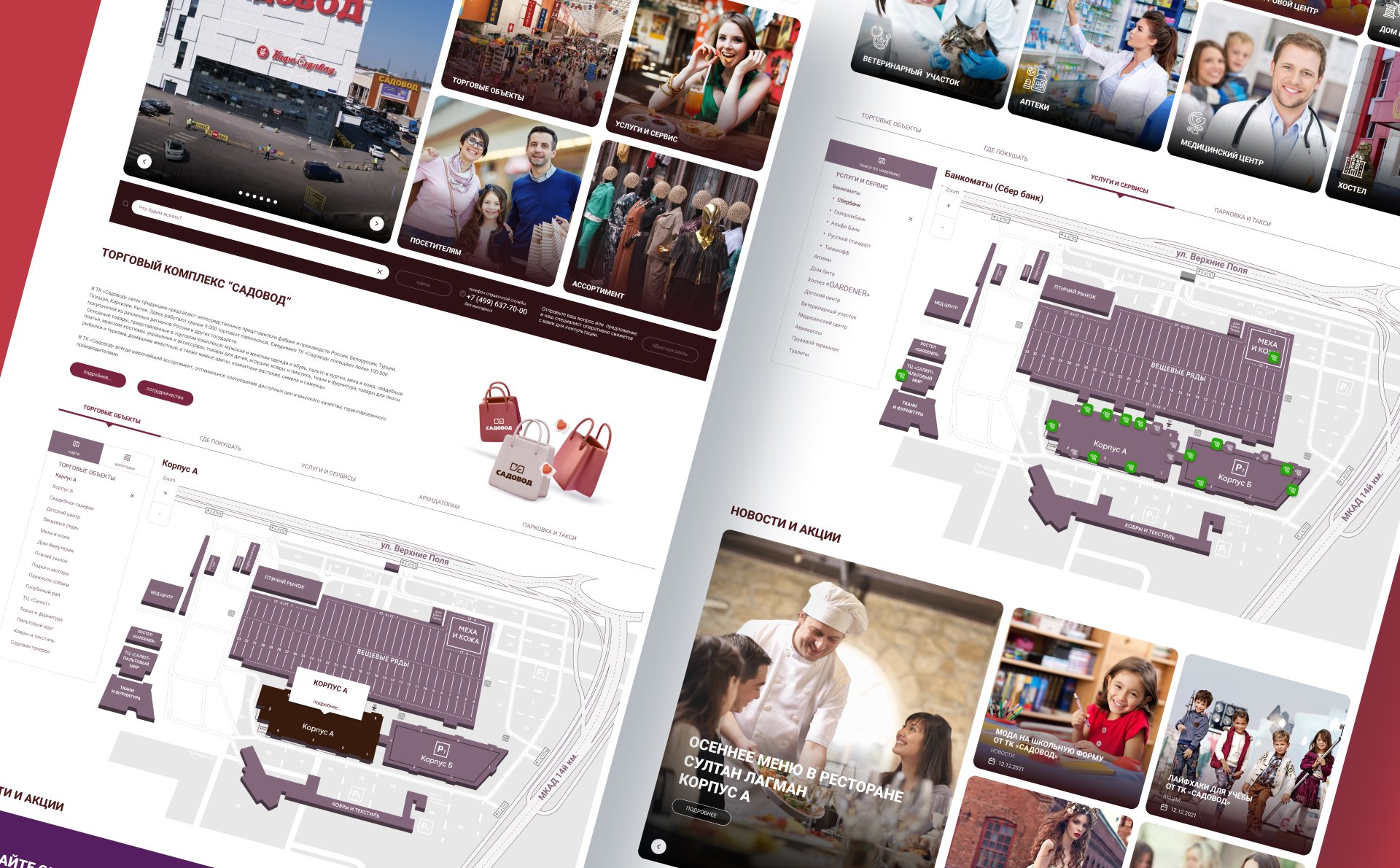 Мы подключились к проекту создания нового сайта для ТК «Садовод» на продвинутом этапе разработки, когда дизайн был полностью отрисован, а базовые страницы — созданы. Наша задача заключалась во внедрении новых разделов, не предусмотренных ранее, включая разнообразные интерактивные карты для внешней и внутренней навигации по комплексу. С декабря 2022 года по март 2024 года мы разработали несколько вариантов функционала, оптимизировали и упростили взаимодействие пользователей с сайтом.