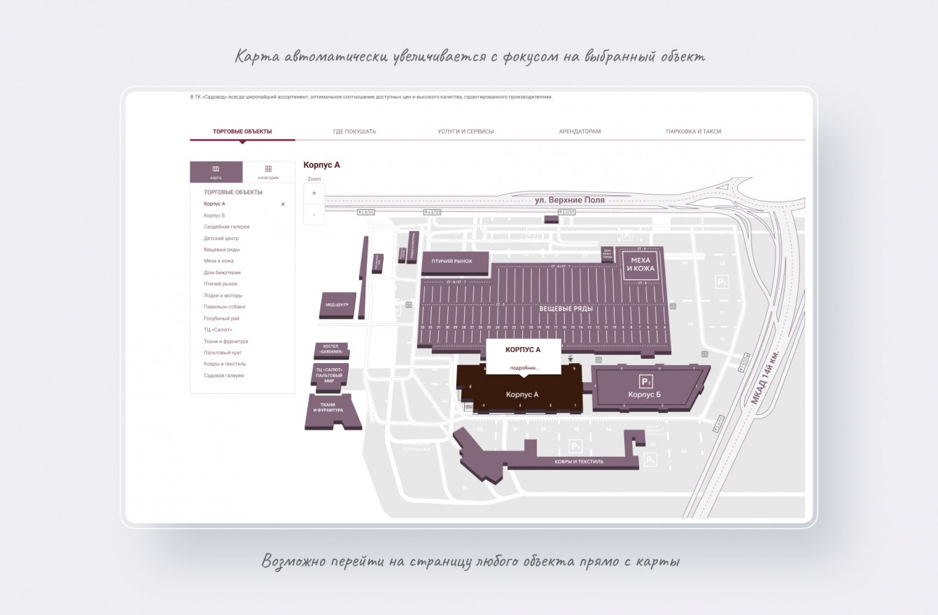 Прежде всего, это разнообразные интерактивные карты, которые должны были быть схожими по функционалу, но отражать особенности внутренних страниц: часть из них шли под внешнюю навигацию по территории ТК, часть должна была раскрывать внутреннее наполнение и служить для упрощения навигации в комплексе.
