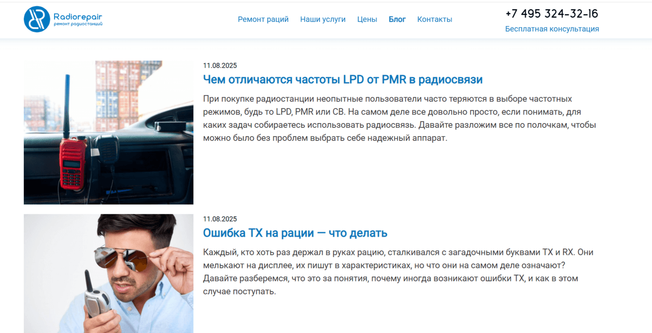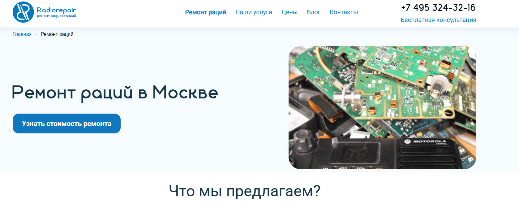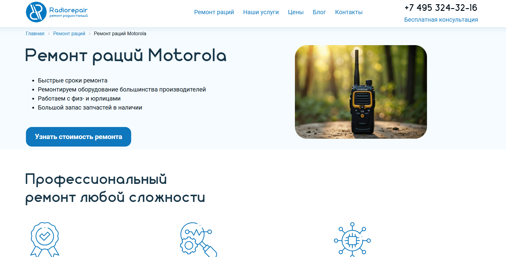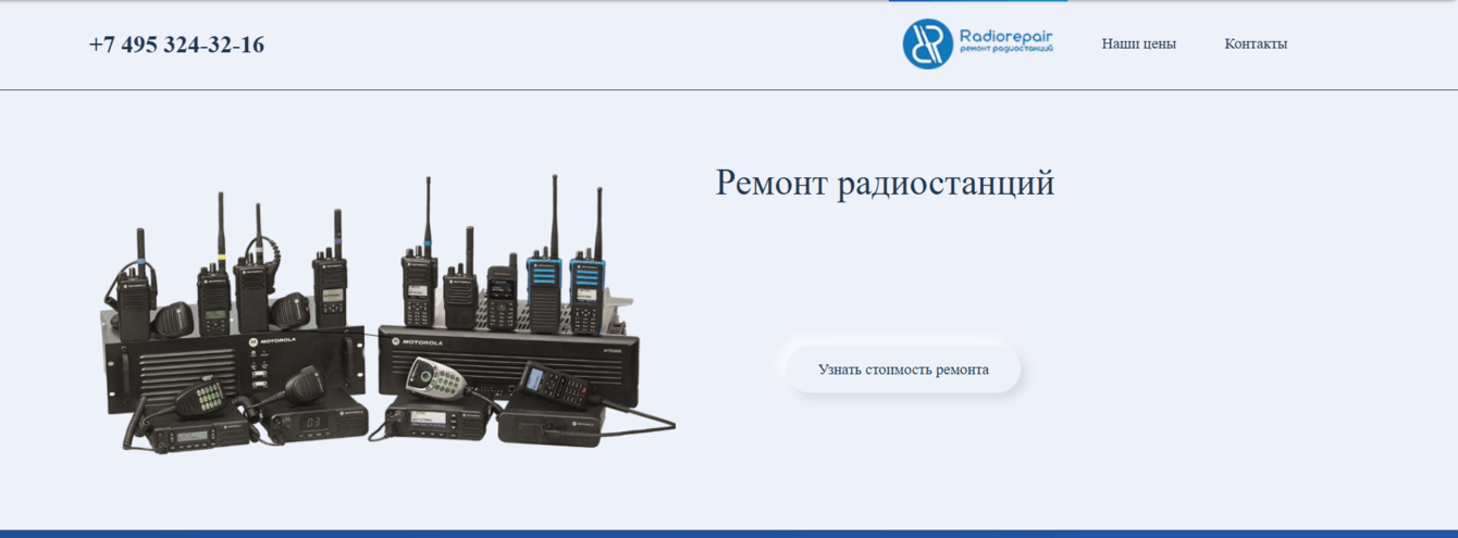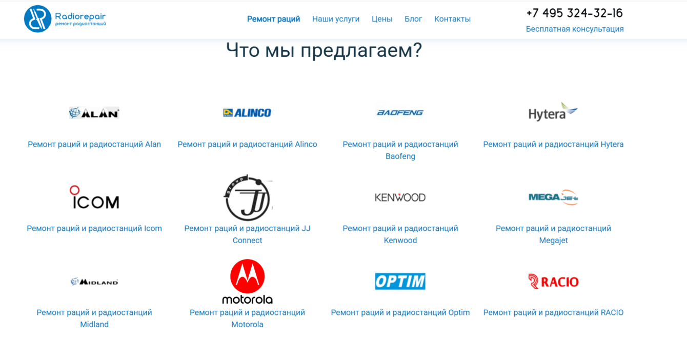 В итоге было решено сайт заменить на более современный, который позволял создать многостраничную структуру с современным дизайном и необходимым функционалом. В частности, страницы под ремонт радиостанций от разных брендов.
