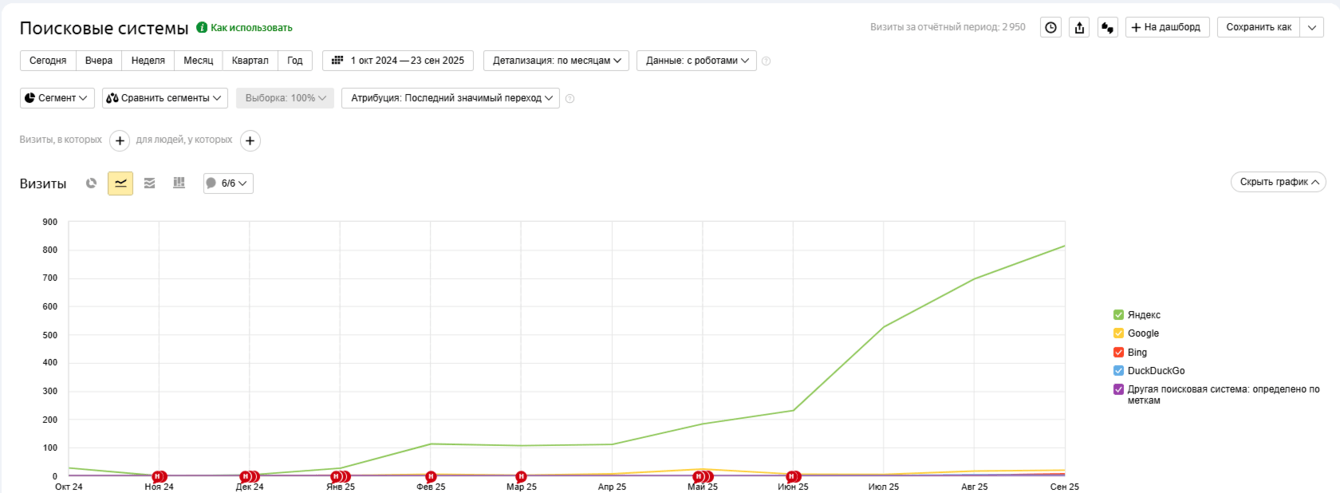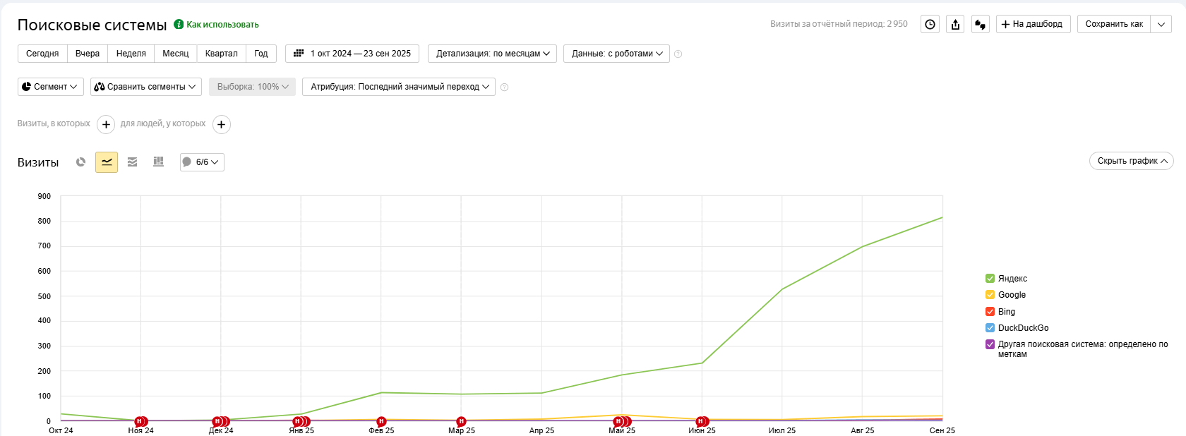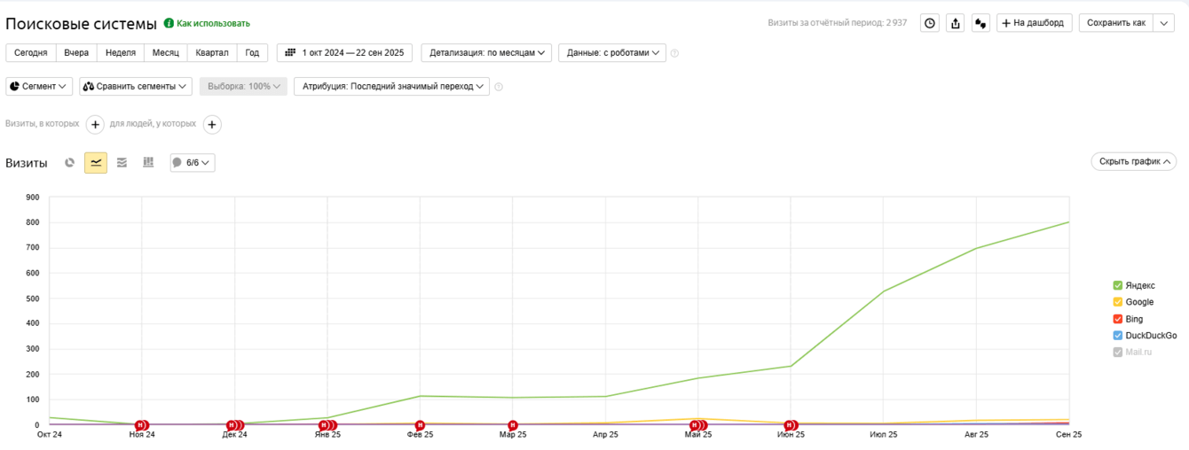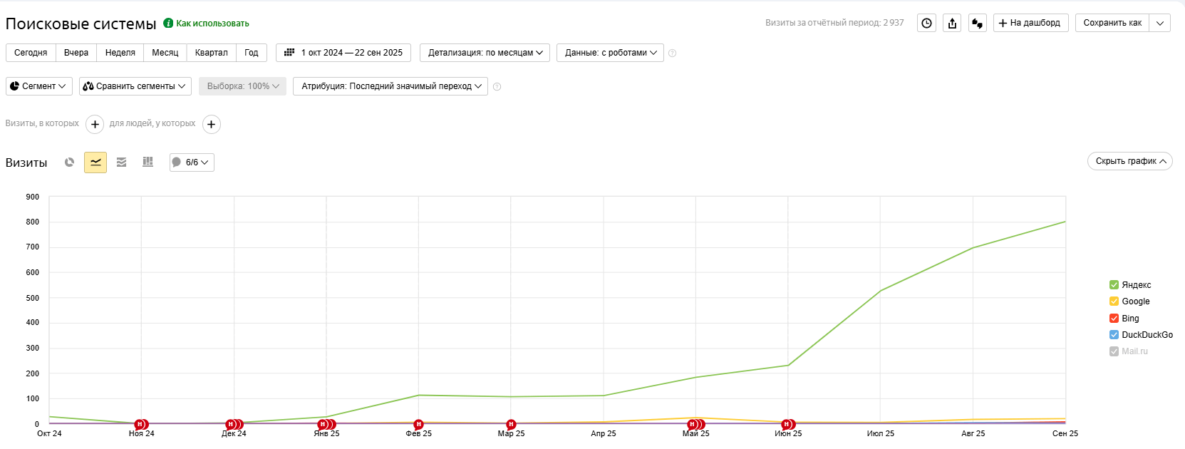 Сайт прорабатывался с участием специалистов по маркетингу и SEO. Были проанализированы конкуренты, подготовлена максимально релевантная нише структура, охвачены все коммерческие запросы в нише. Уже в феврале 2025 года сайт начал расти (примерно 4 месяца со старта работы) и далее динамика строго положительная. На 23 сентября 2025 года за сентябрь уже более 800 визитов из Яндекс.