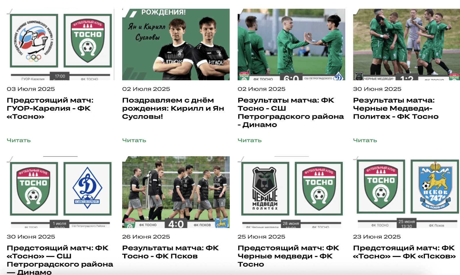 Чтобы оценить сайт в контексте рынка, мы провели конкурентный анализ. Изучили решения ведущих клубов — от федеральных (например, «Спартак», «Зенит») до региональных («Тюмень» и др.). У многих из них на первом экране вынесены календарь матчей, турнирная таблица и ключевые новости, активно используются разделы «История клуба» и «Академия», развиты медиа-блоки и удобные формы обратной связи. На их фоне сайт «Тосно» выглядел устаревшим и перегруженным, что ещё раз подтвердило необходимость кардинальных изменений. Эти наблюдения легли в основу предложенных решений.