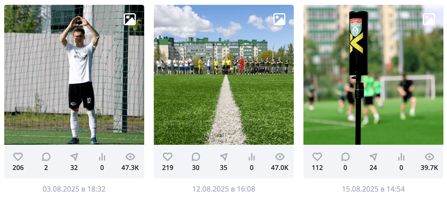 Работа с социальной сетью началась в июле 2024 года. У клиента уже было оформленное сообщество, и стиль публикаций мы сохранили, т.к. он был разработан клиентом в соответствии с фирменным стилем футбольного клуба.