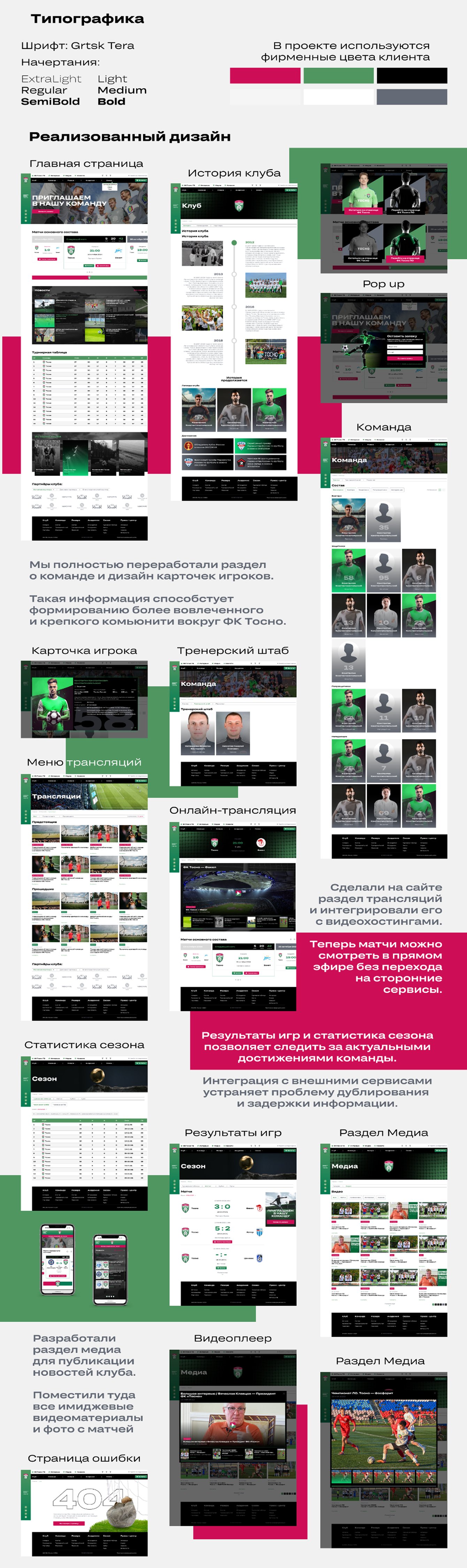 Общую структуру выстроили по стандартной модели для футбольных клубов: новости, календарь матчей, команда, академия, история клуба и медиаматериалы.