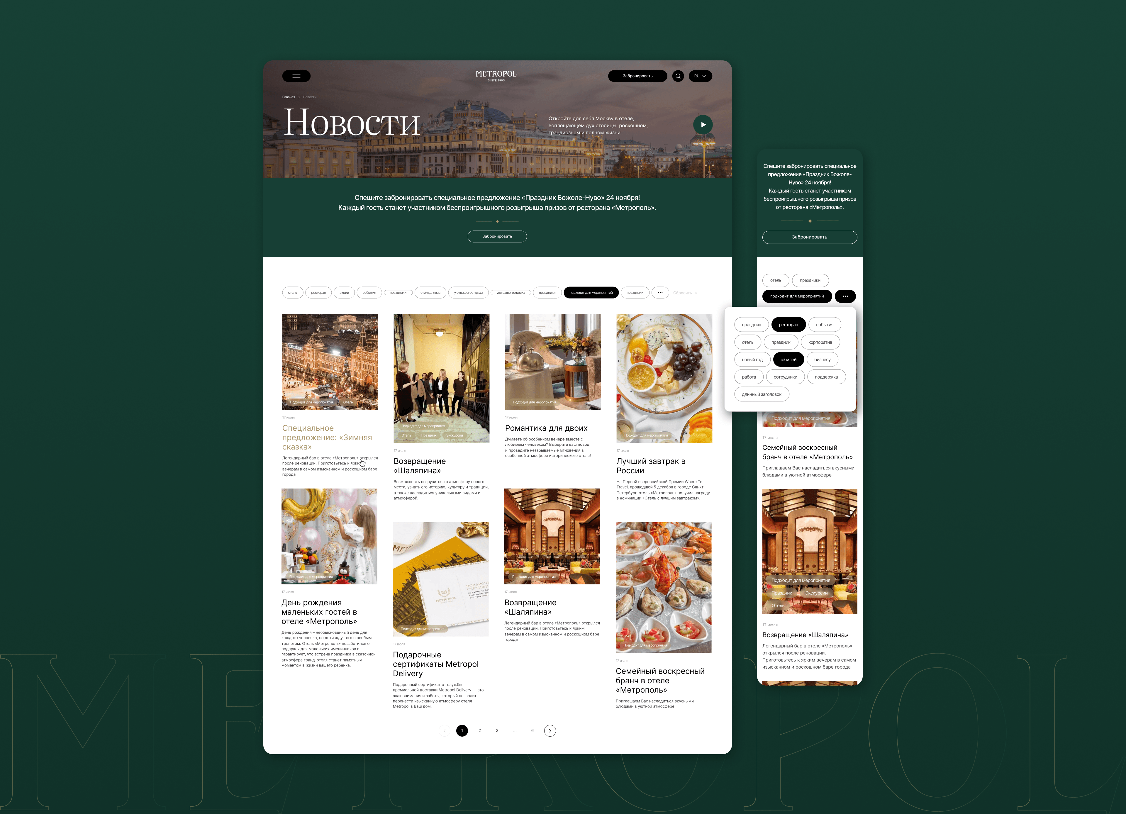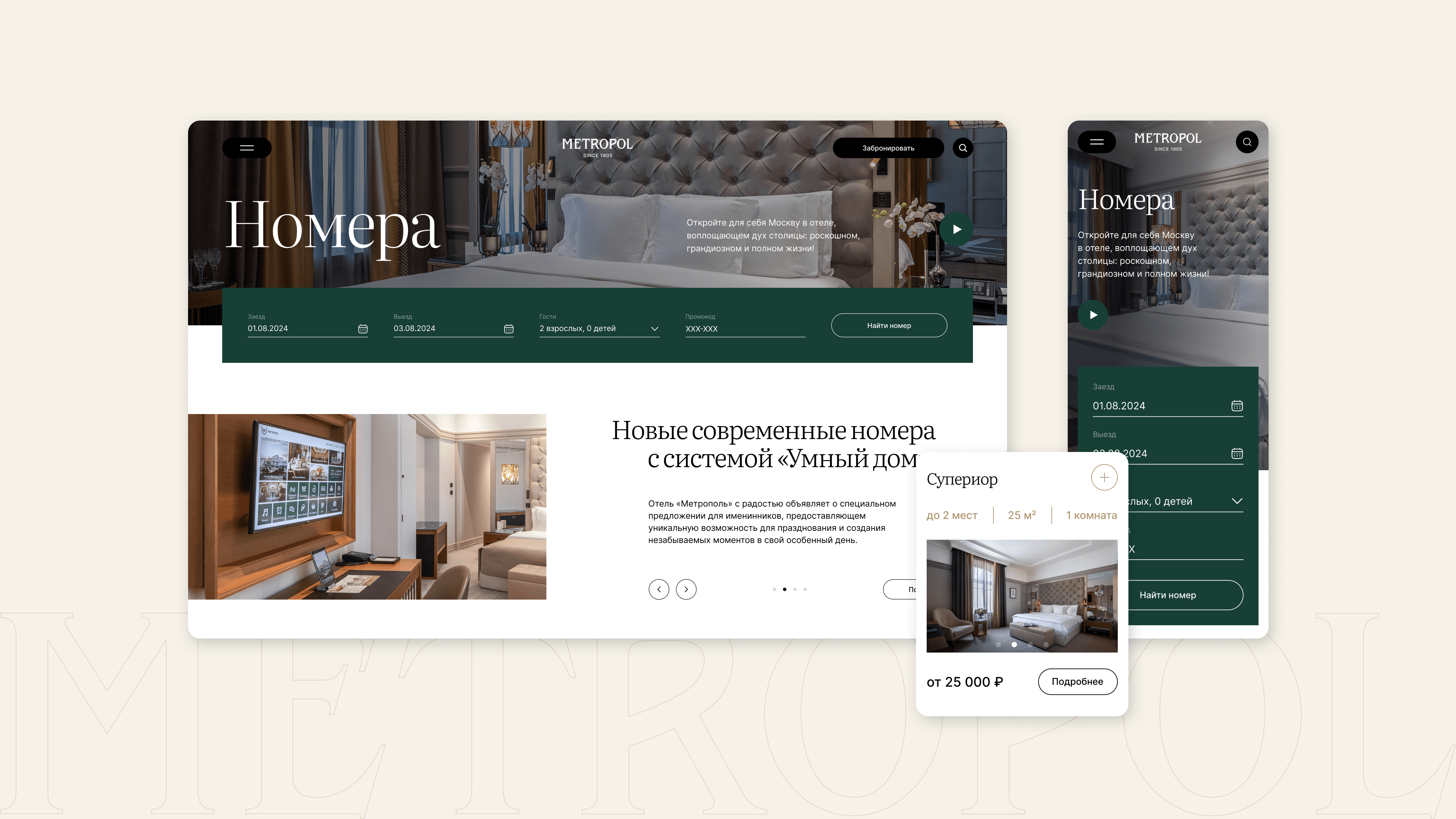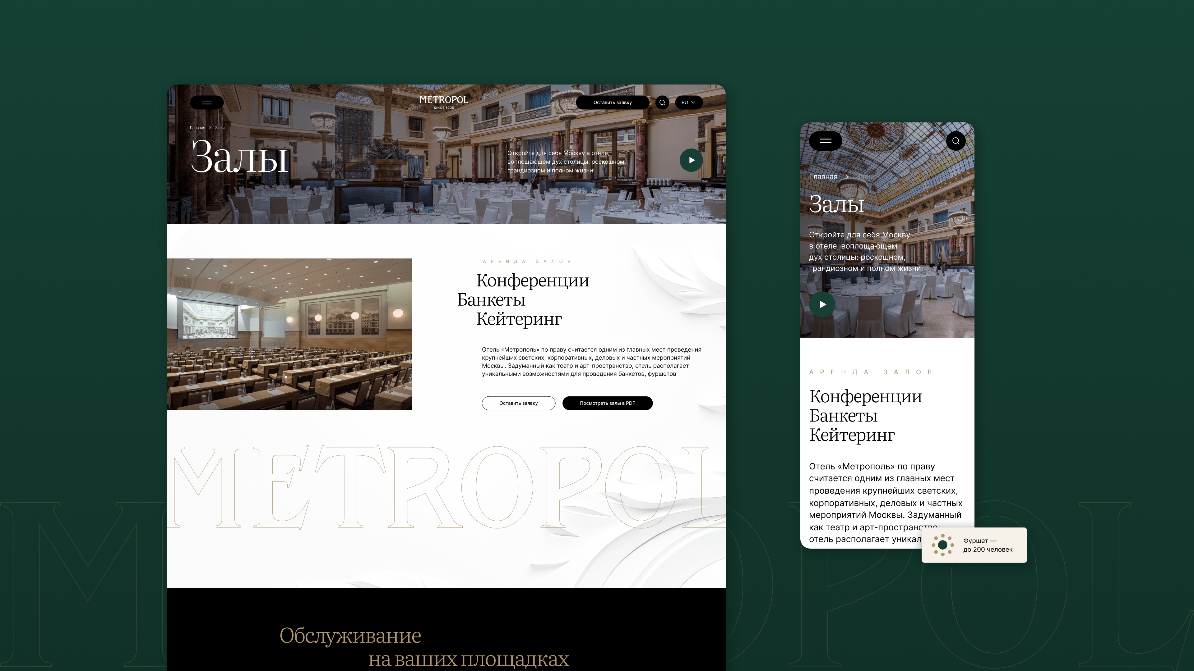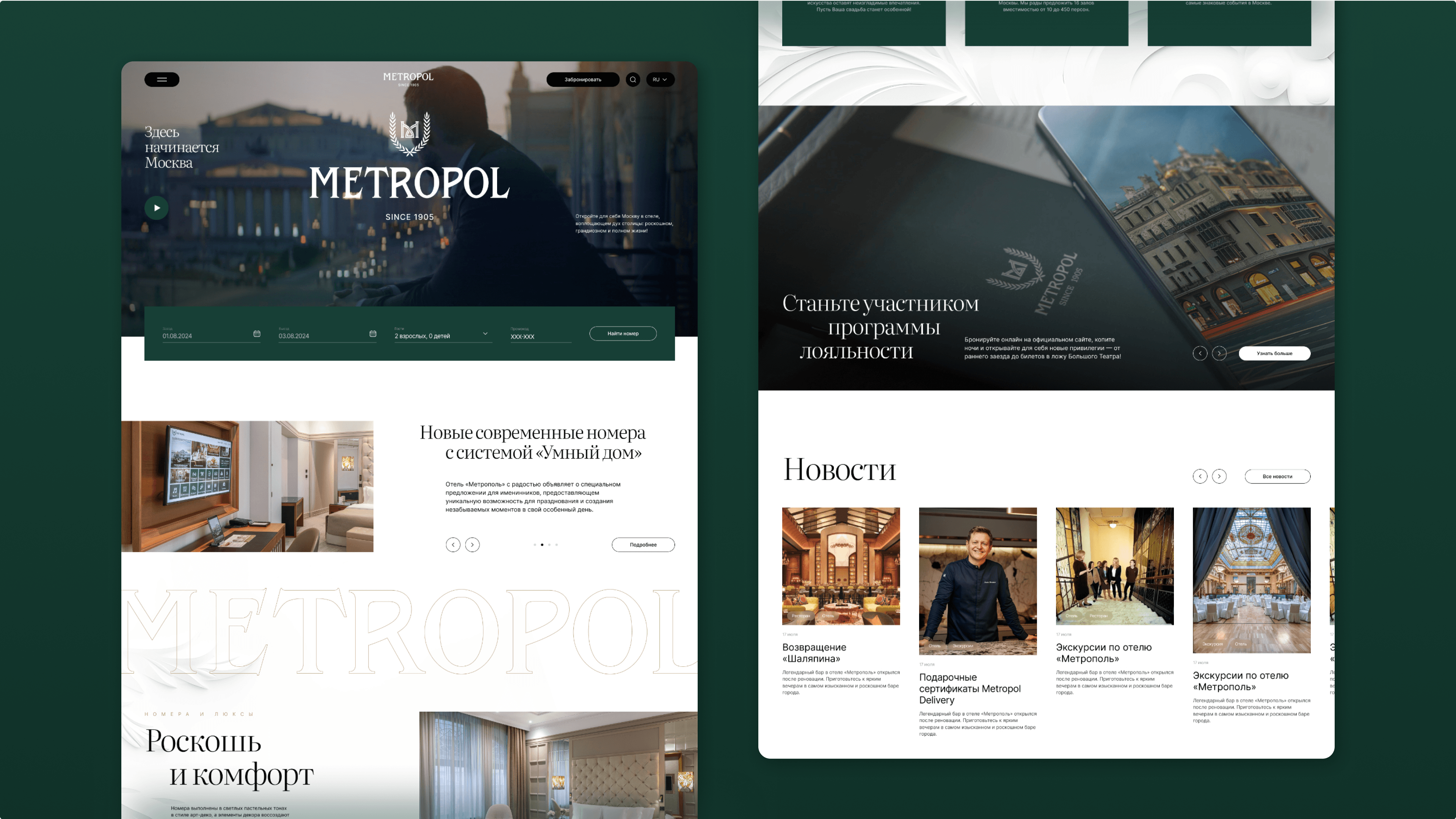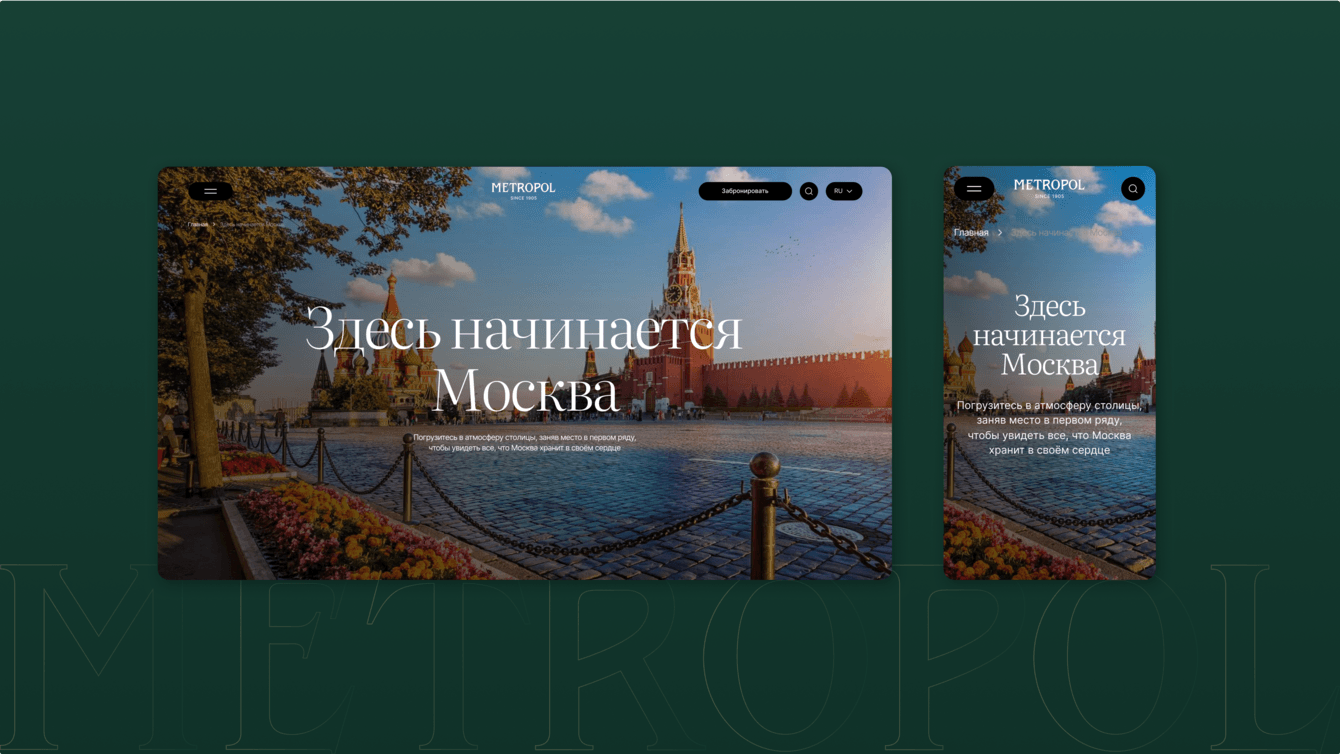 Дизайн сайта, разработанный нами на основе концепции наших друзей из Notamedia, подчёркивает статус бренда «Метрополь» и премиальный сервис, гарантированный клиентам отеля.