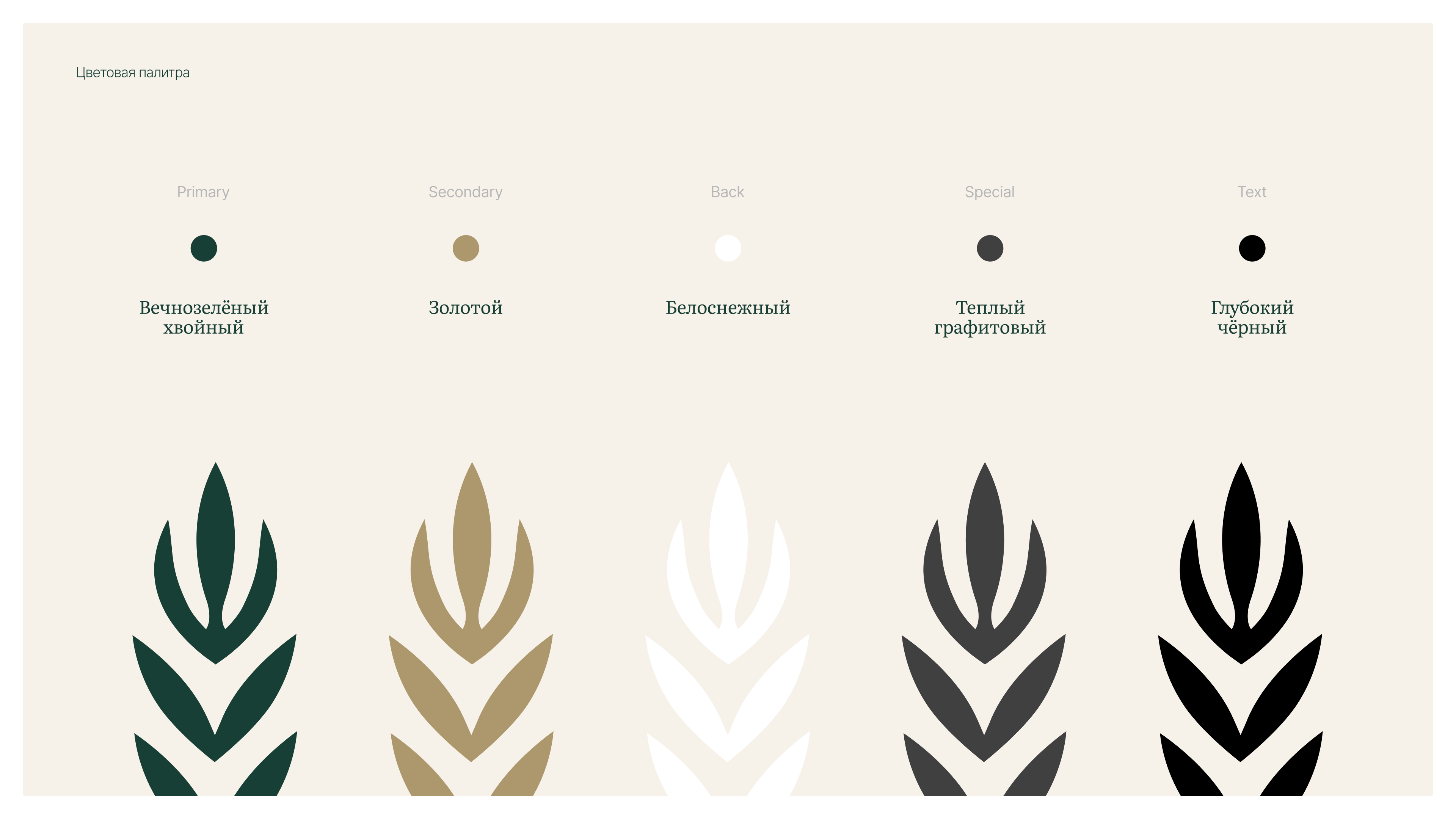 Цветовая палитра сайта сочетает хвойный зелёный, глубокий чёрный и тёплый графитовый. Золотые акценты добавляют роскоши и изящества, а белоснежные элементы — ощущение чистоты и лёгкости.