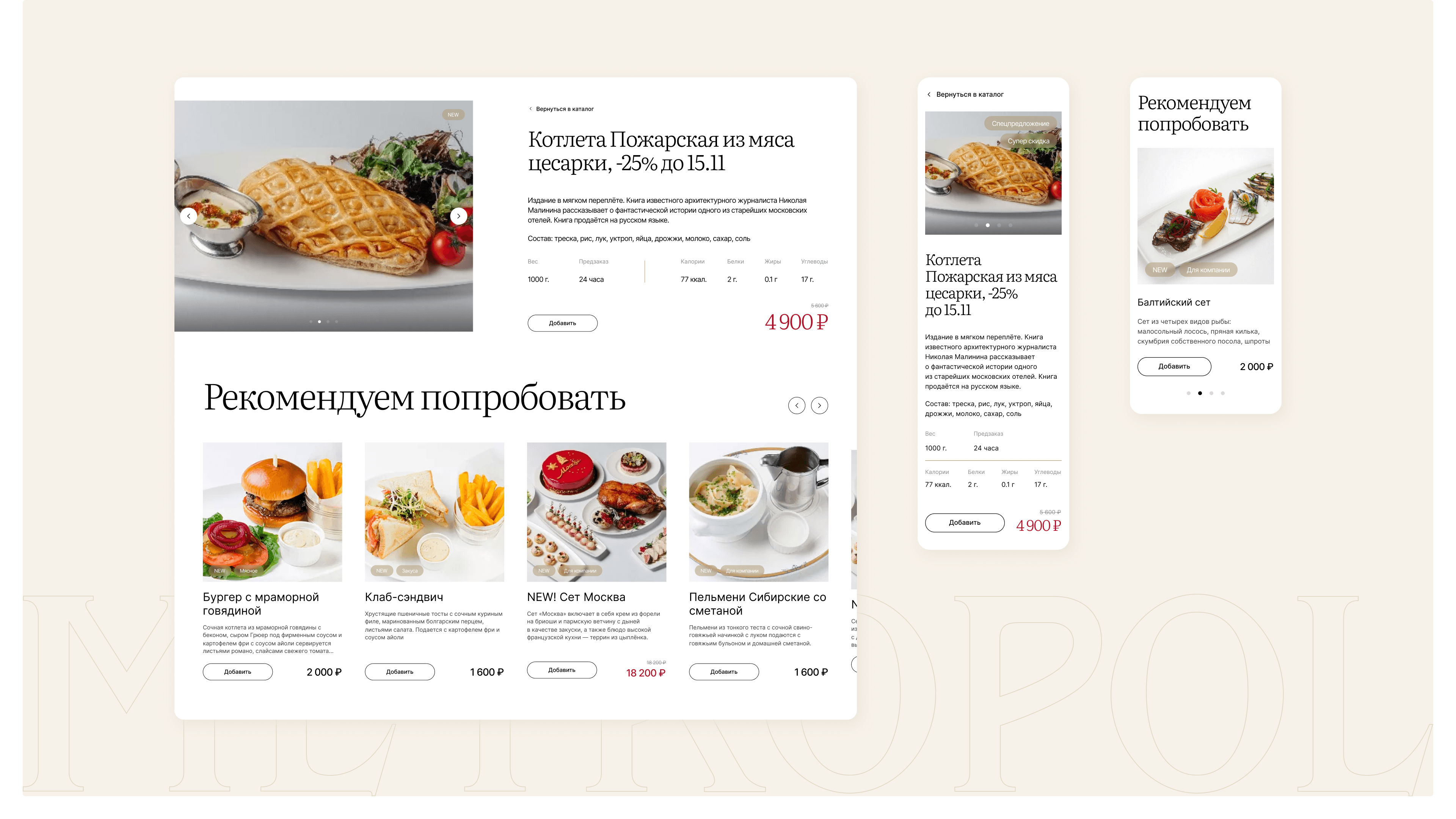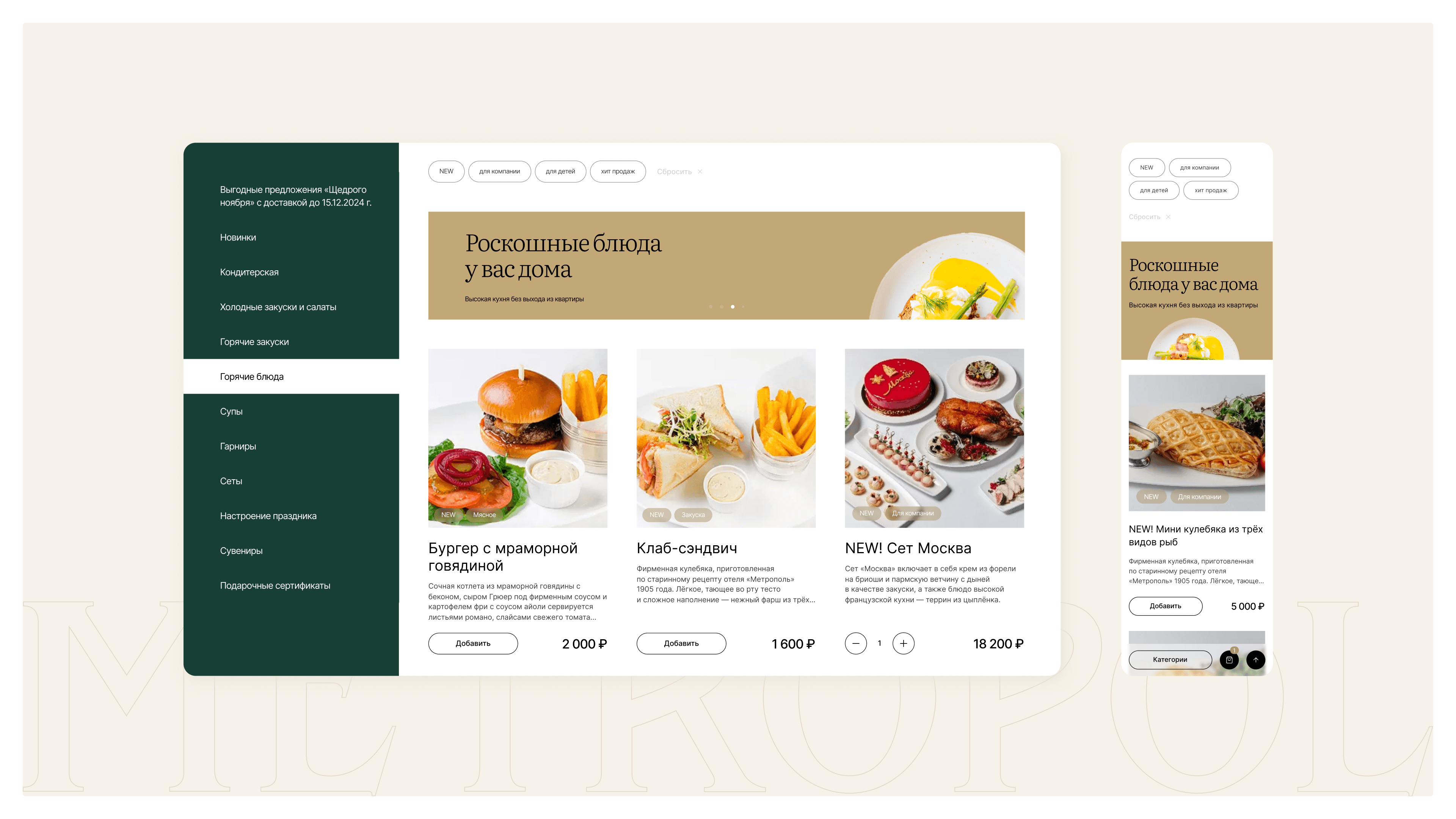 Благодаря реализации на новом сайте полноценного e-commerce функционала, появилась возможность заказывать доставку на дом готовых блюд и десертов из ресторана «Метрополь».