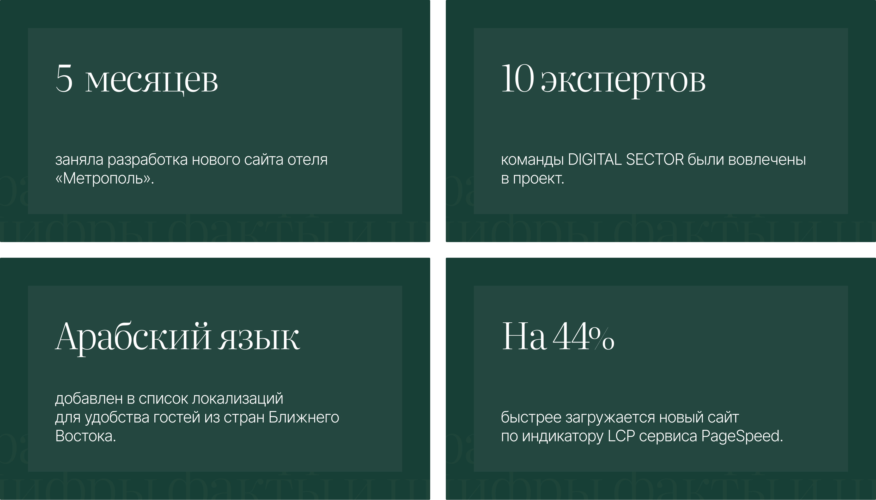 DIGITAL SECTOR не только разработал сайт «Метрополя» с нуля, но и занимается его технической поддержкой. Мы очень гордимся проделанной нами работой и сотрудничеством с легендарным историческим отелем.