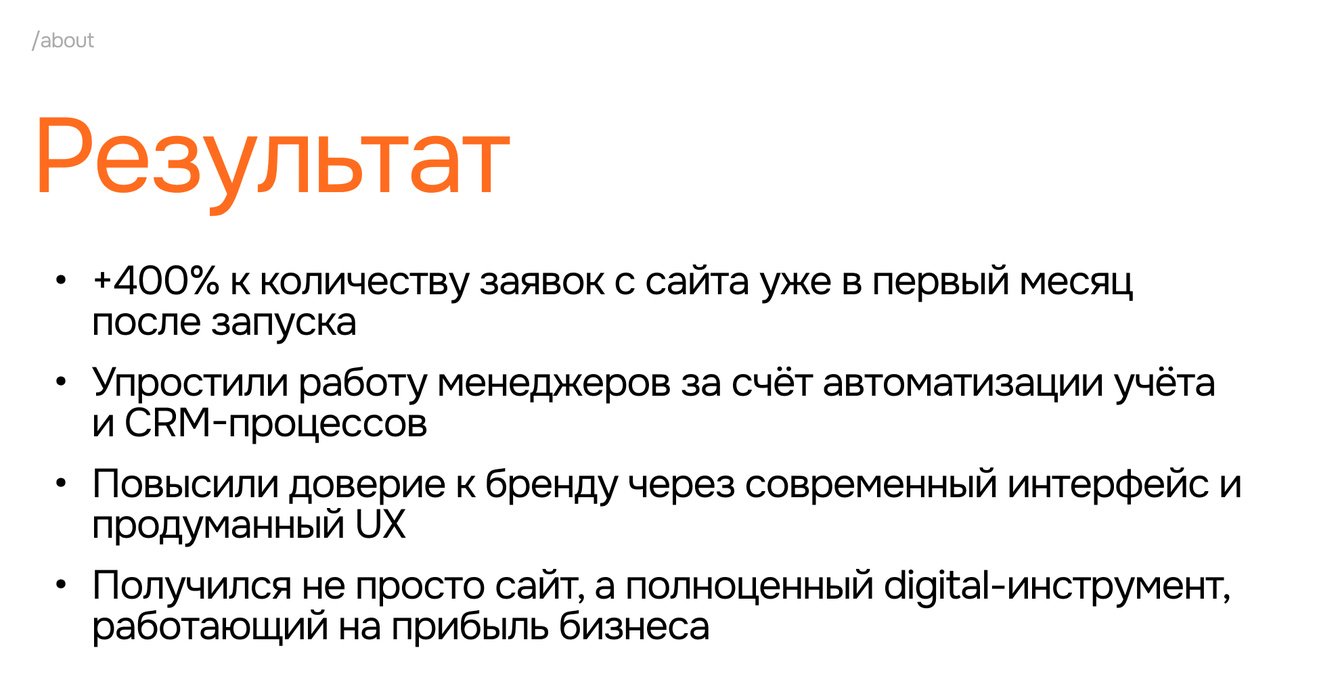 Этот проект стал для нас примером того, как правильный подход к каждому этапу — от исследований до запуска — превращает обычный сайт в реально работающий бизнес-инструмент. Мы вместе с клиентом прожили путь трансформации их цифрового продукта. Мне особенно запомнилось, как они радовались первым результатам аналитики — когда видишь, что твоя работа приносит не просто красоту, а рост бизнеса, это и есть настоящее удовольствие от профессии.