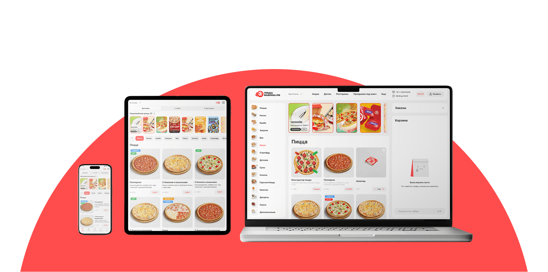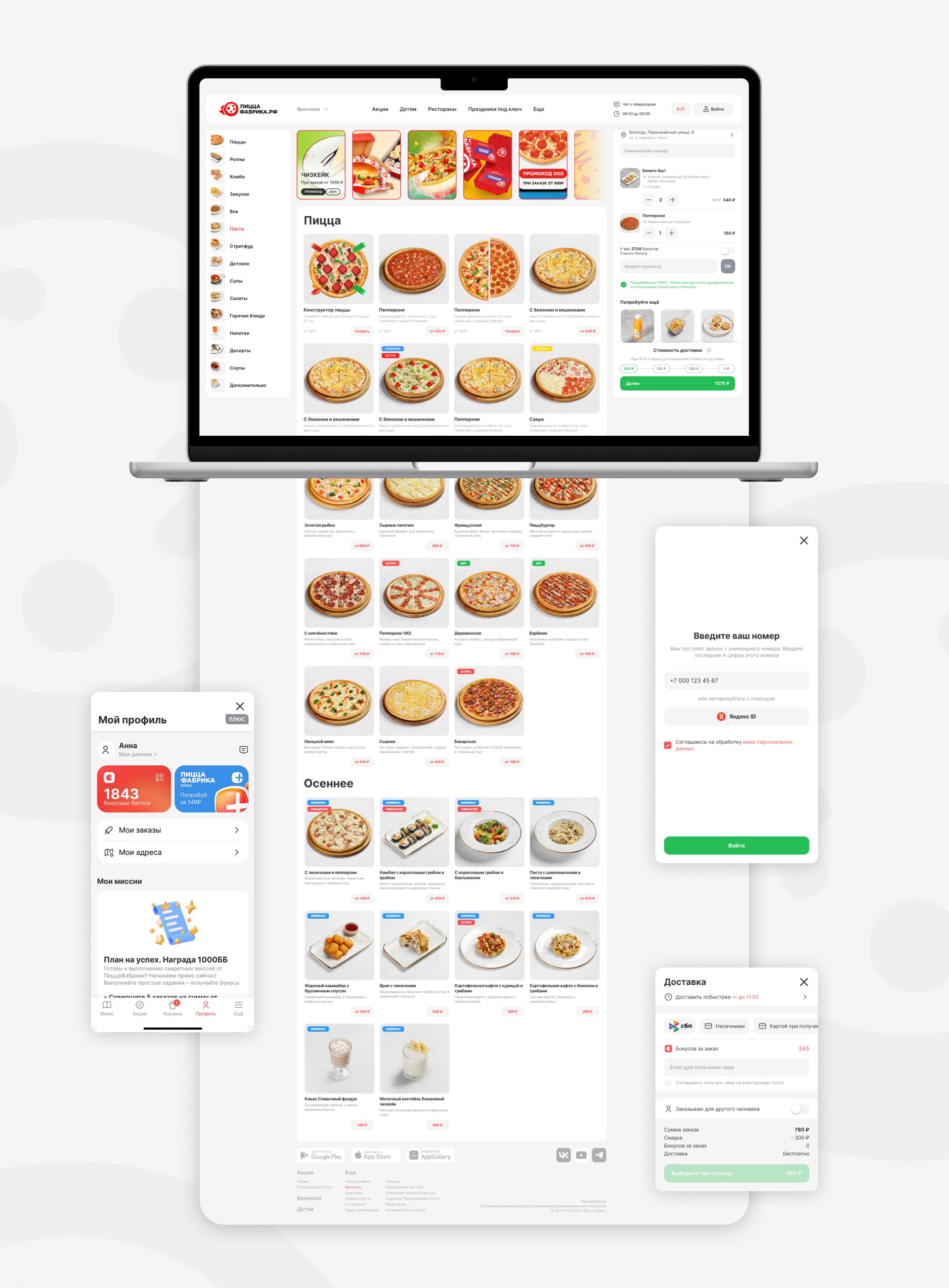 За основу дизайна мы взяли существующее мобильное приложение ПиццаФабрика. Компоненты десктоп-версии повторяют приложение.