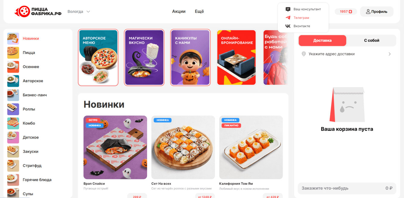 — Список основных категорий меню и корзину с возможностью выбора способа доставки, которая всегда на виду.