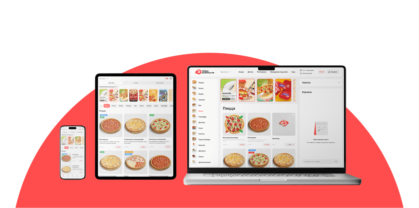 Это уже второй проект, выполненный нами для сети семейных ресторанов ПиццаФабрика. Ранее мы с нуля переработали мобильное приложение. В нём, помимо оформления заказа на доставку и самовынос, можно оформить самостоятельно заказ за свой столик без привлечения официанта. Заказ до столика доставит робот-официант.