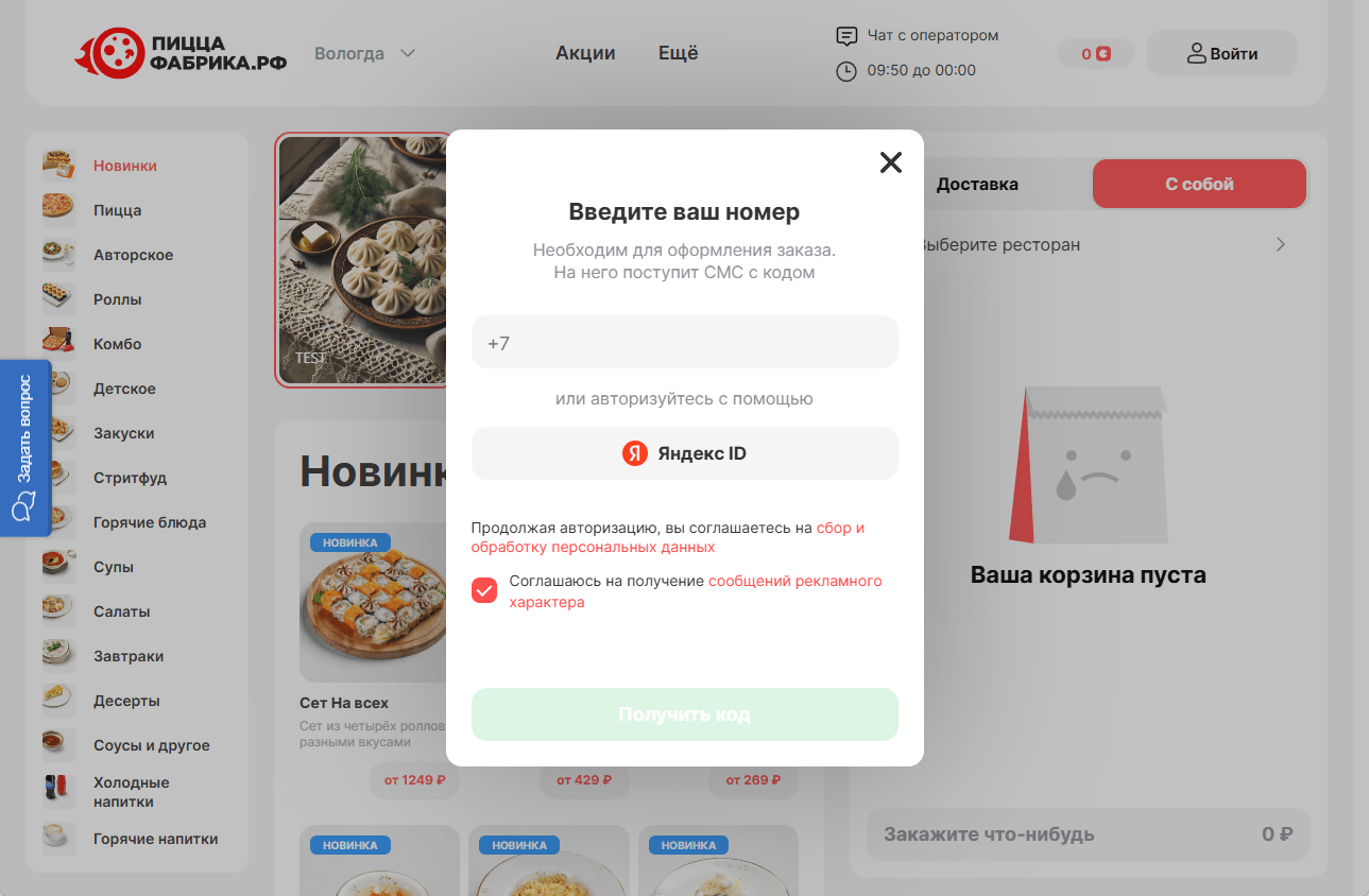 Для подтверждения заказа потребуется авторизация по номеру телефона и подтверждение через смс или звонок. Регистрация личного кабинета единая на весь сайт и филиалы. В качестве альтернативы можно использовать Telegram. Регистрация облегчает повторный ввод данных и ускорение оформления последующих заказов.